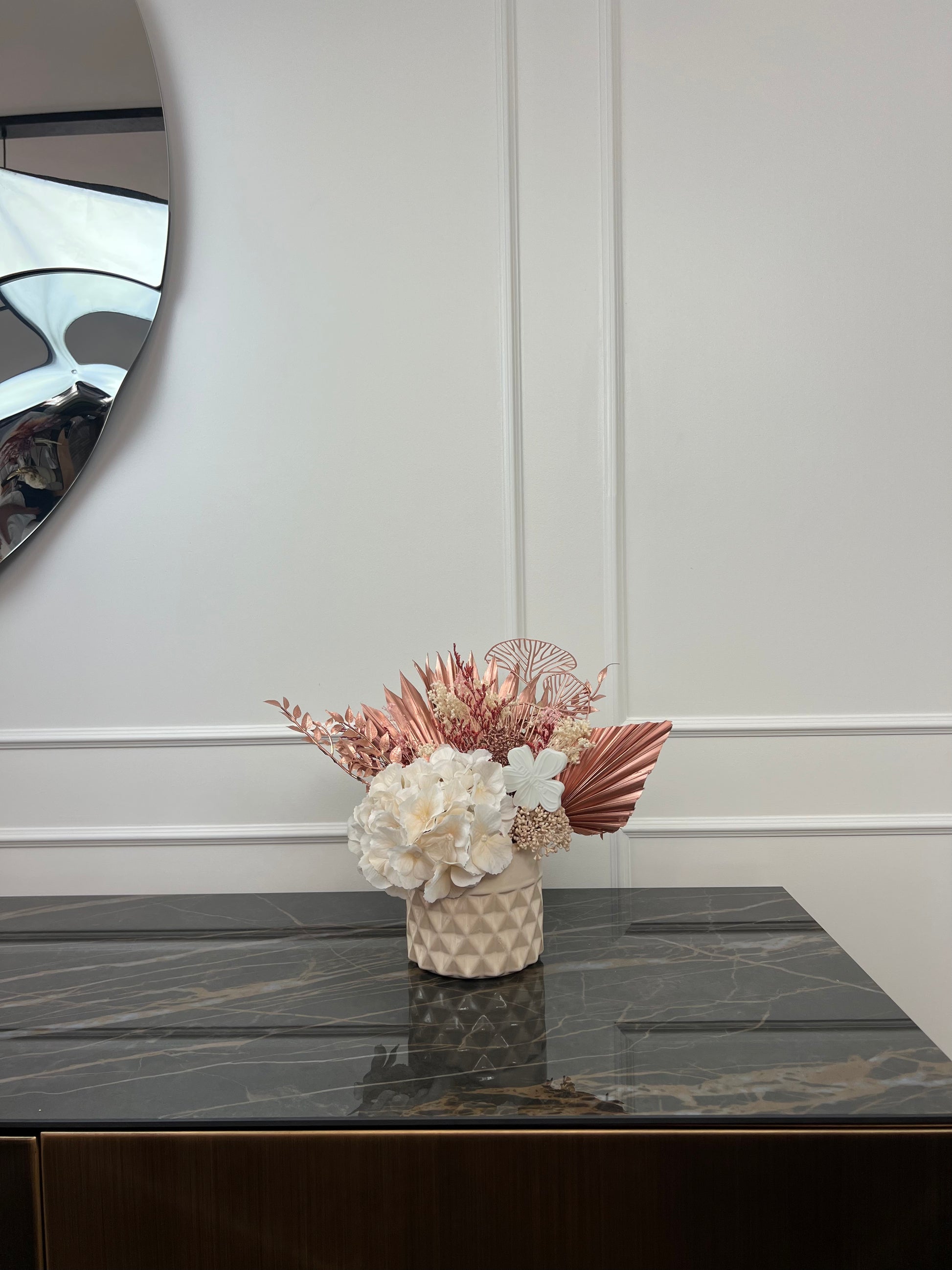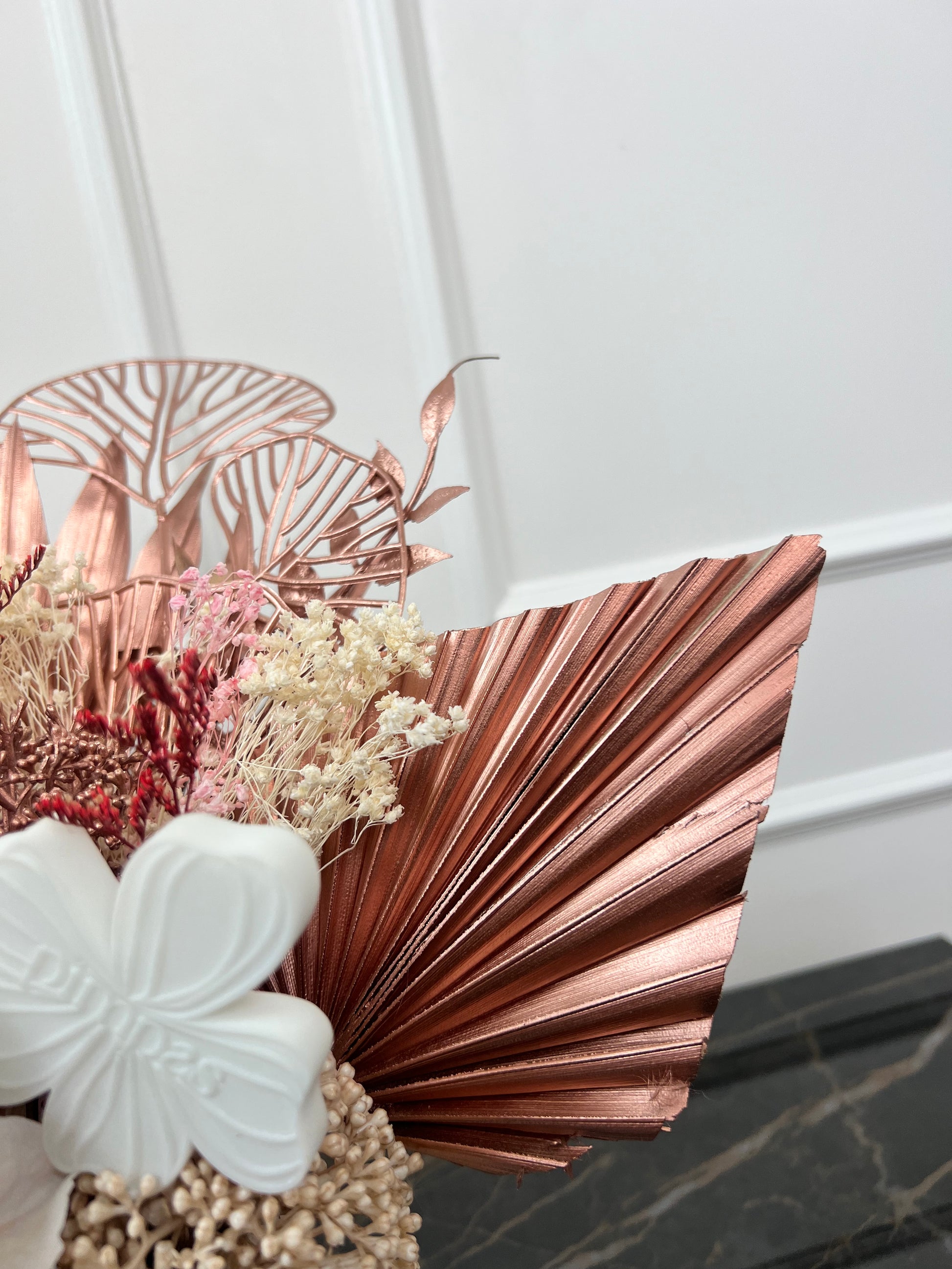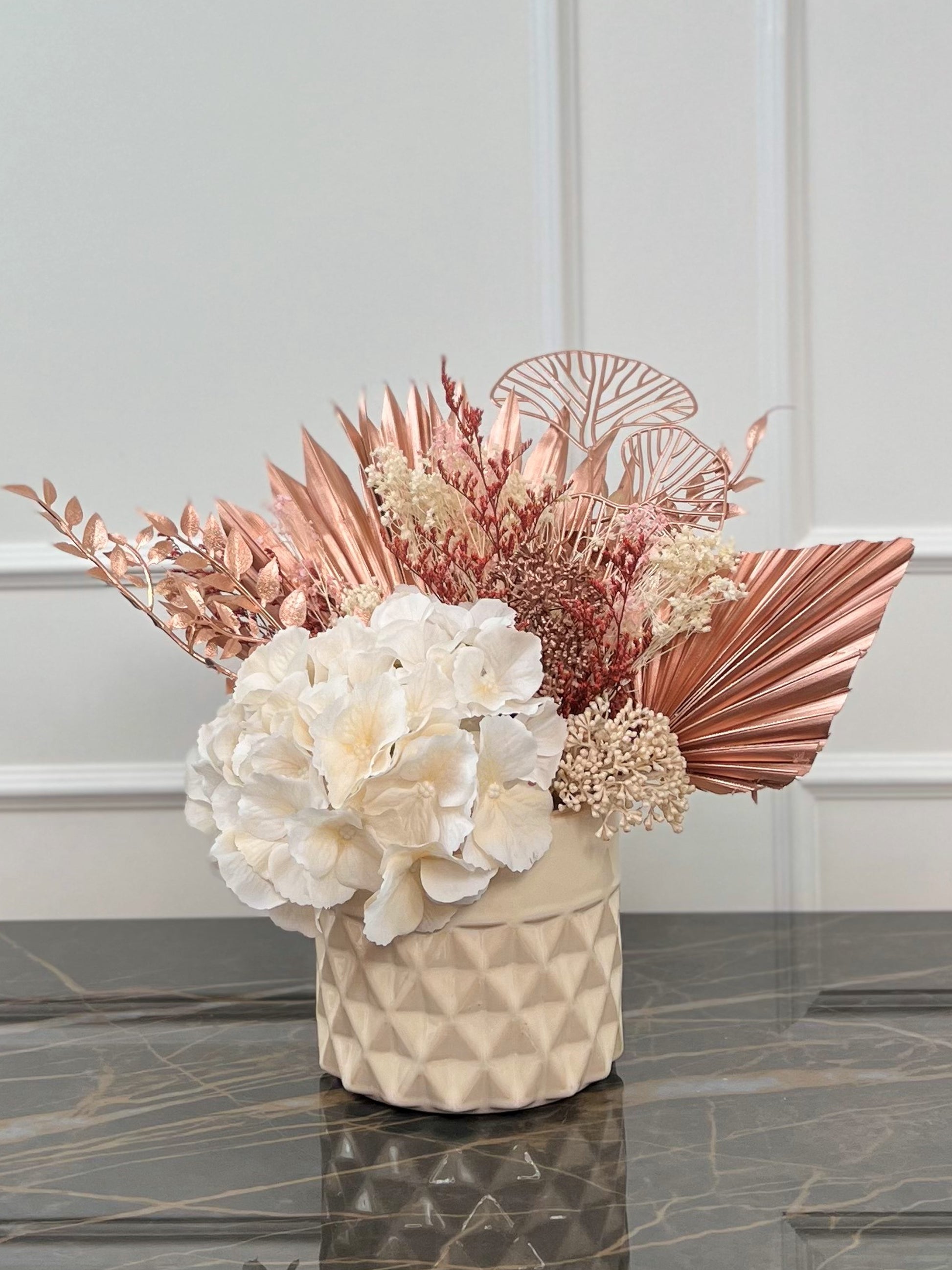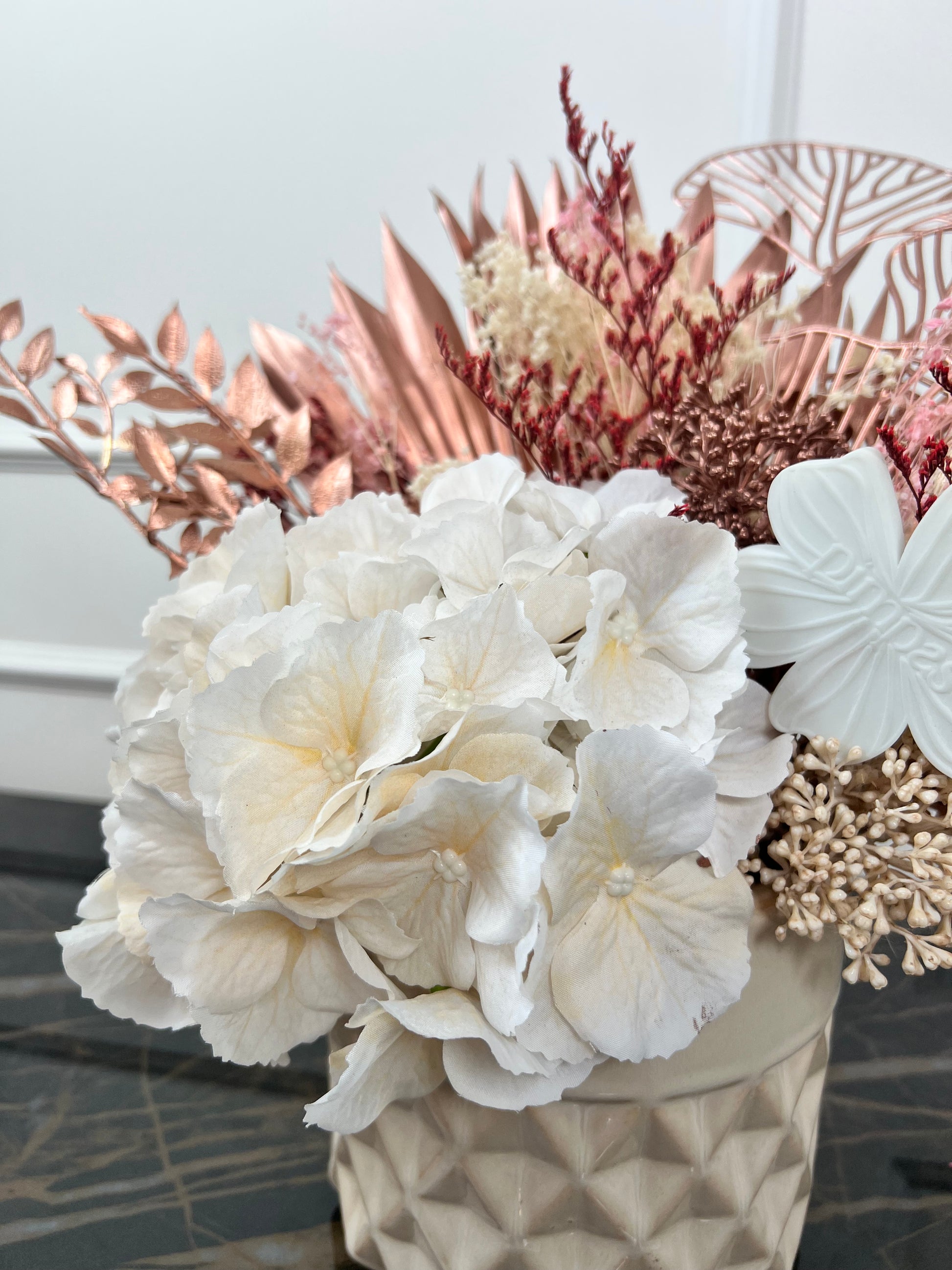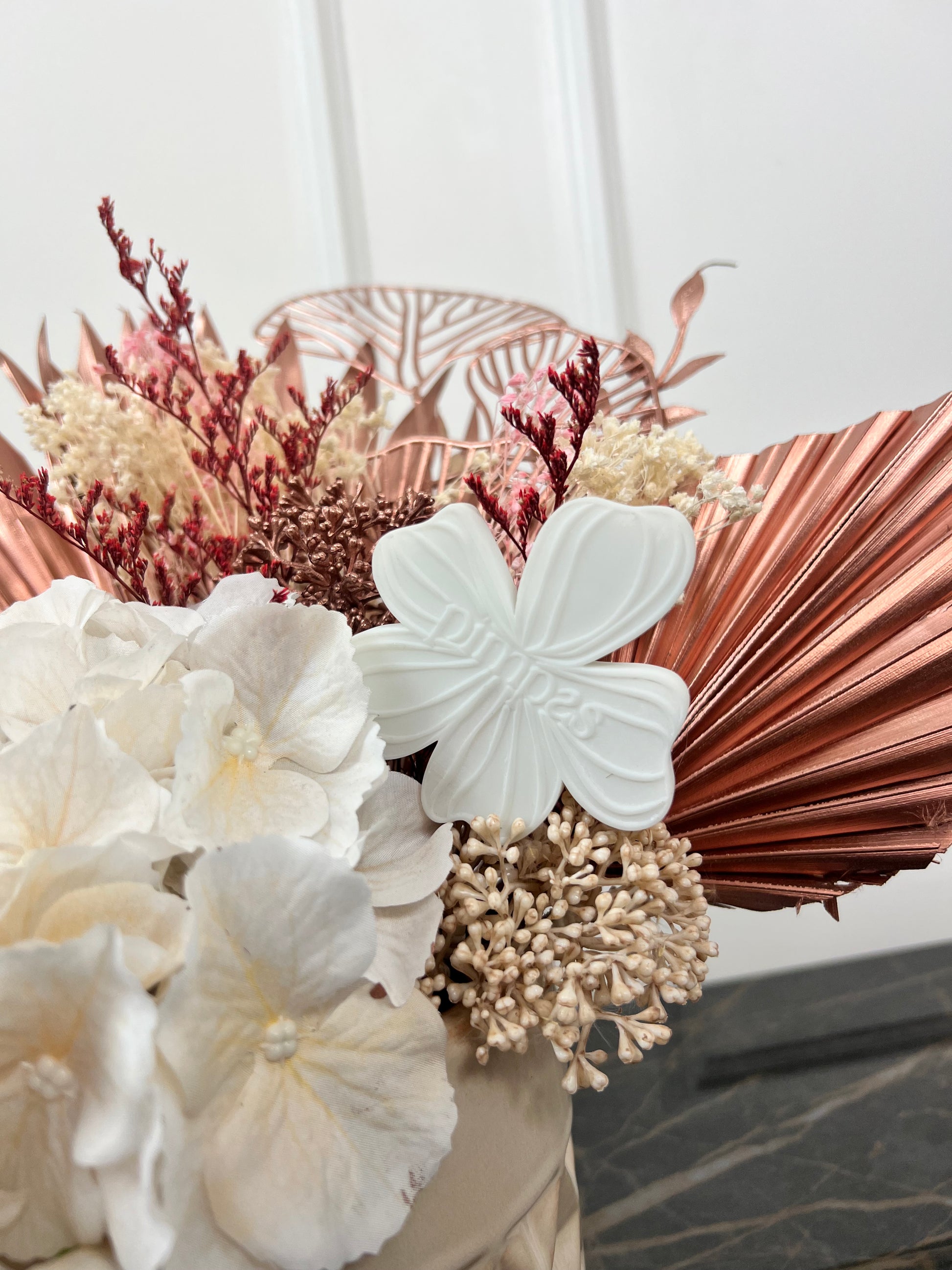 Un bouquet tout en délicatesse, où les teintes douces se mêlent aux reflets rosés. L’hortensia blanc apporte de la rondeur, accompagné d’avoine pour une touche champêtre chic. Les nuances subtiles de branchage se fondent avec élégance dans un la composition. Une composition lumineuse et poétique qui sublime chaque espace avec légèreté.