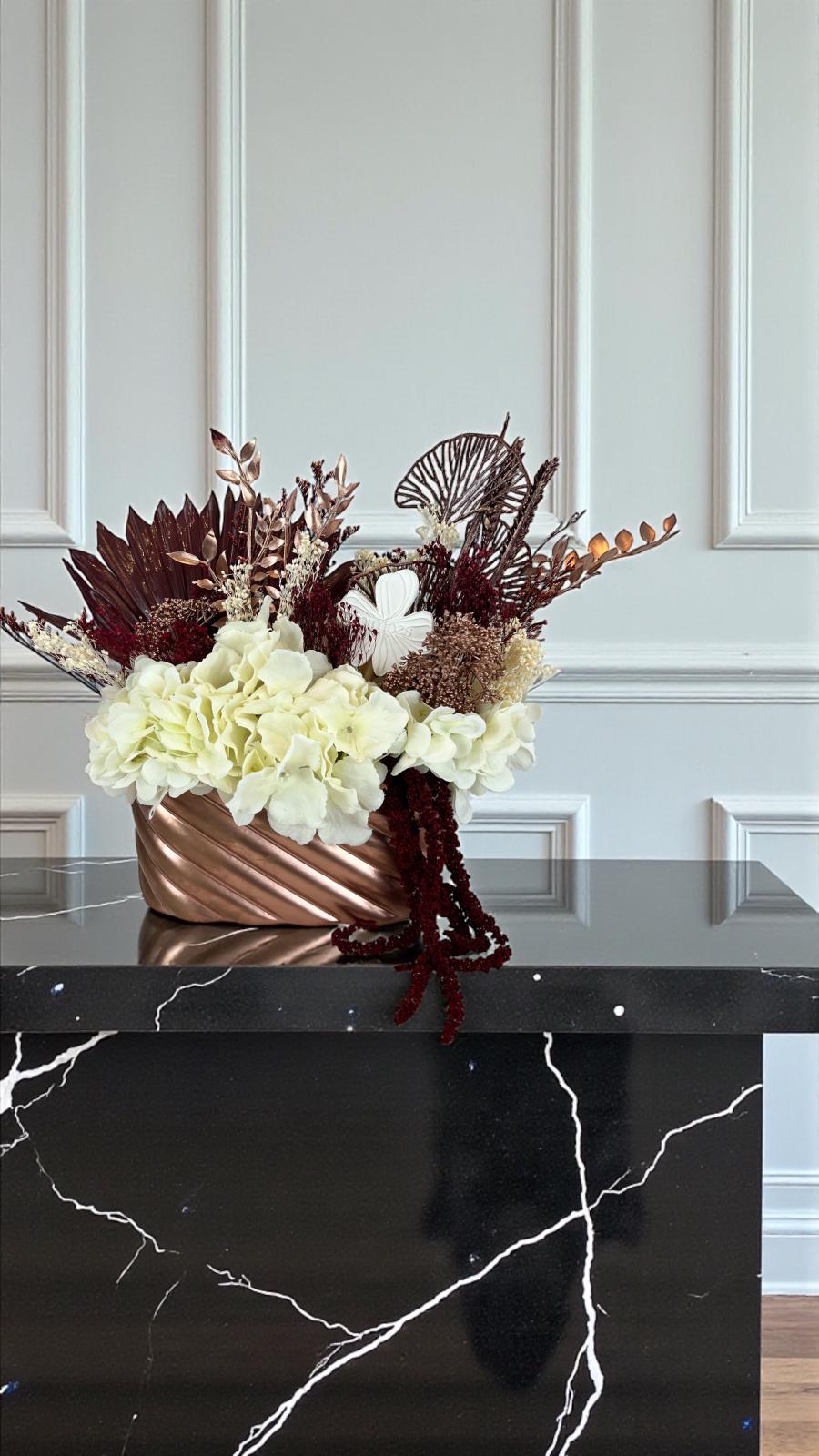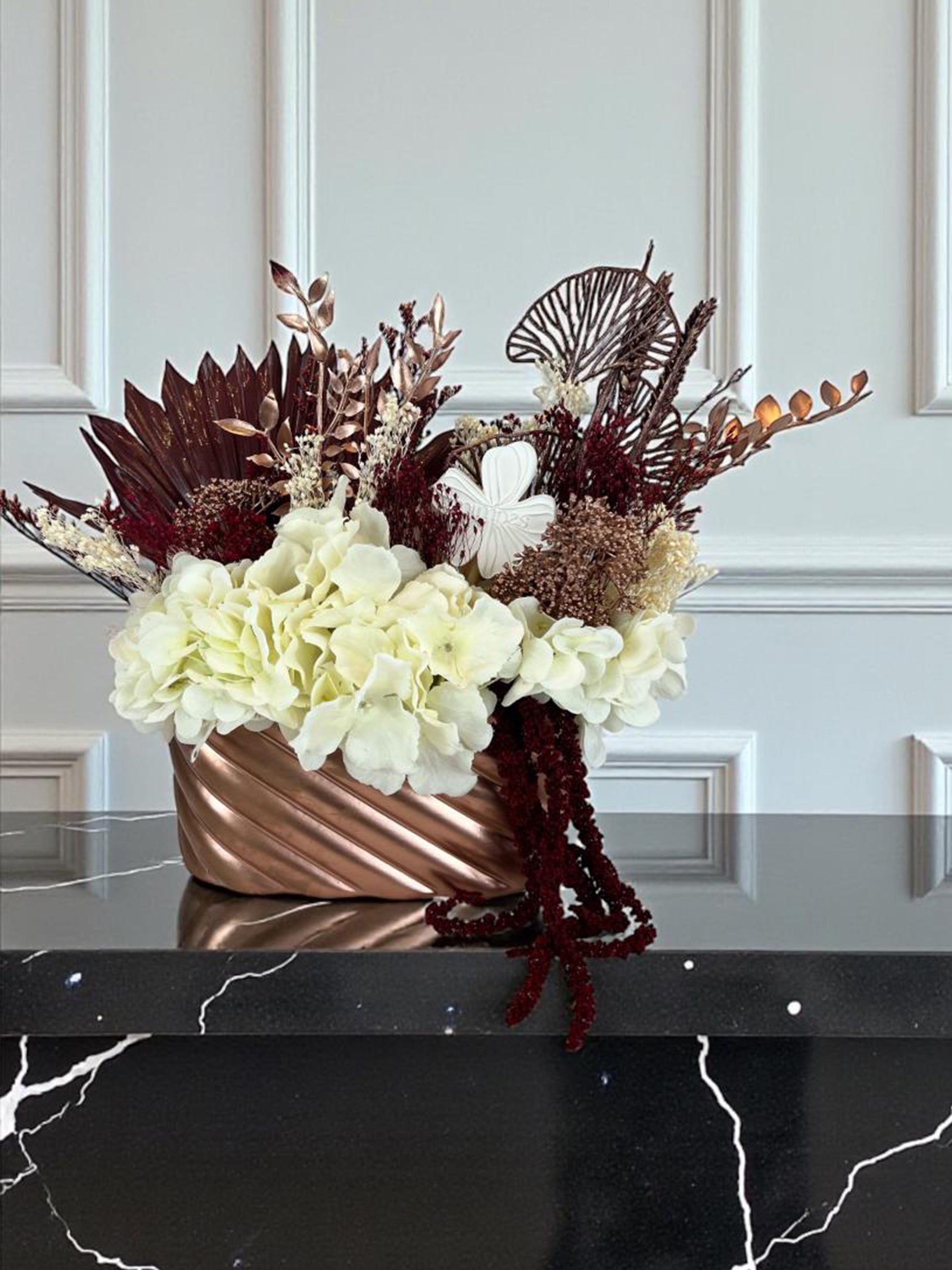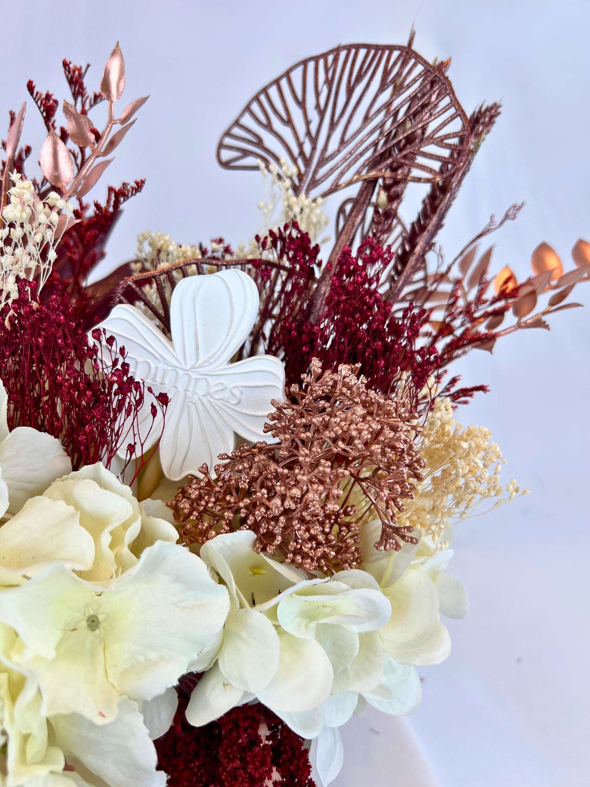Un bouquet incandescent, où l’éclat du blanc pur rencontre la profondeur d’un bordeaux flamboyant. Les hortensias, généreux et vaporeux, forment une base lumineuse, presque immaculée, sur laquelle viennent se lover les textures riches de l’amarante tombante et du branchage en duo de teintes. Le palmier soleil et les feuilles de ginkgo dessinent des lignes puissantes, structurantes, tandis que le ruscus et le desmodium apportent des jeux de densité et de matière. L’avoine, légère, et les épis de blé doré insufflent mouvement et chaleur. Aura de Feu évoque une beauté dramatique, à la croisée d’un automne brûlant et d’une élégance minérale, entre contraste et intensité.