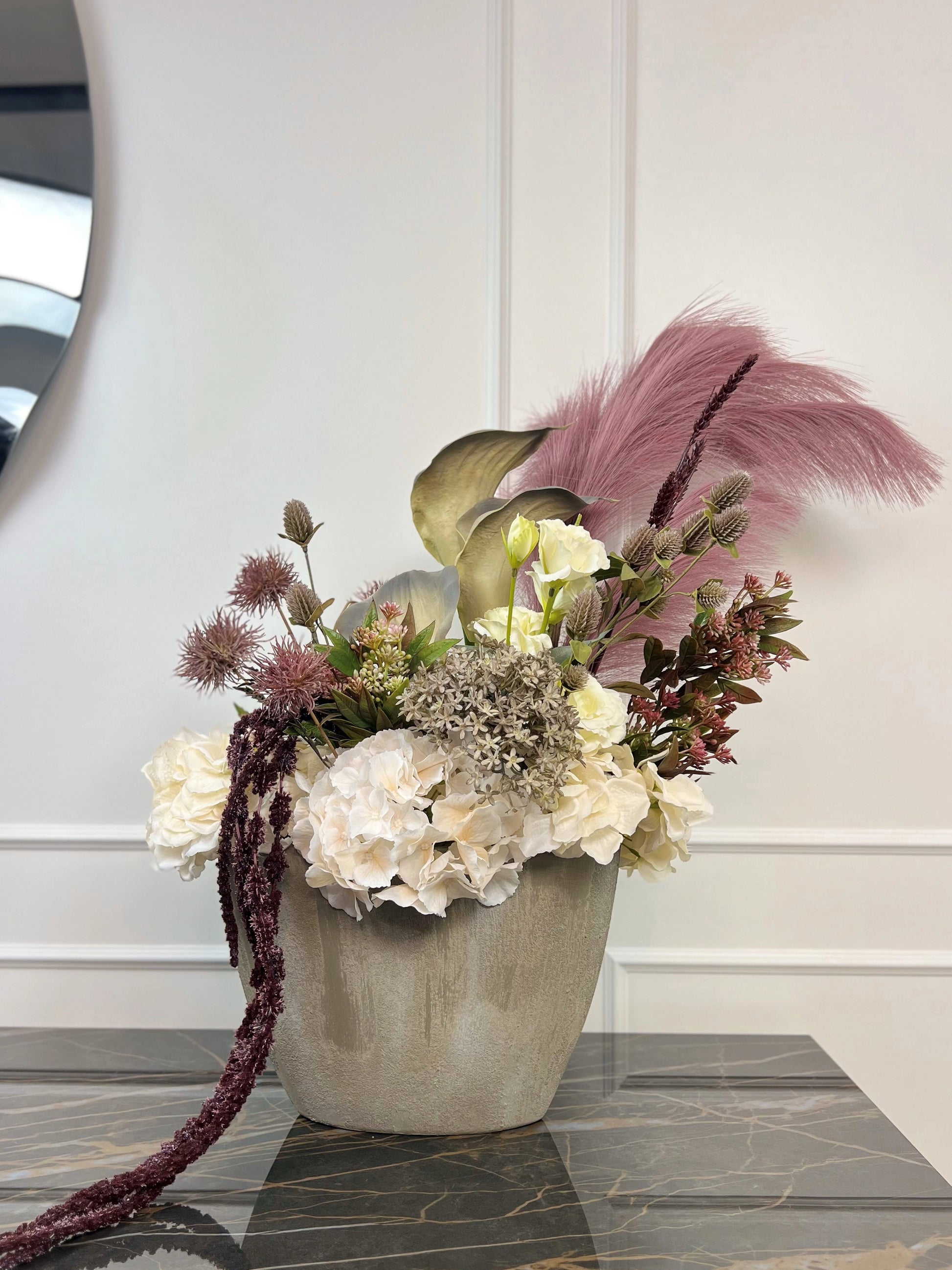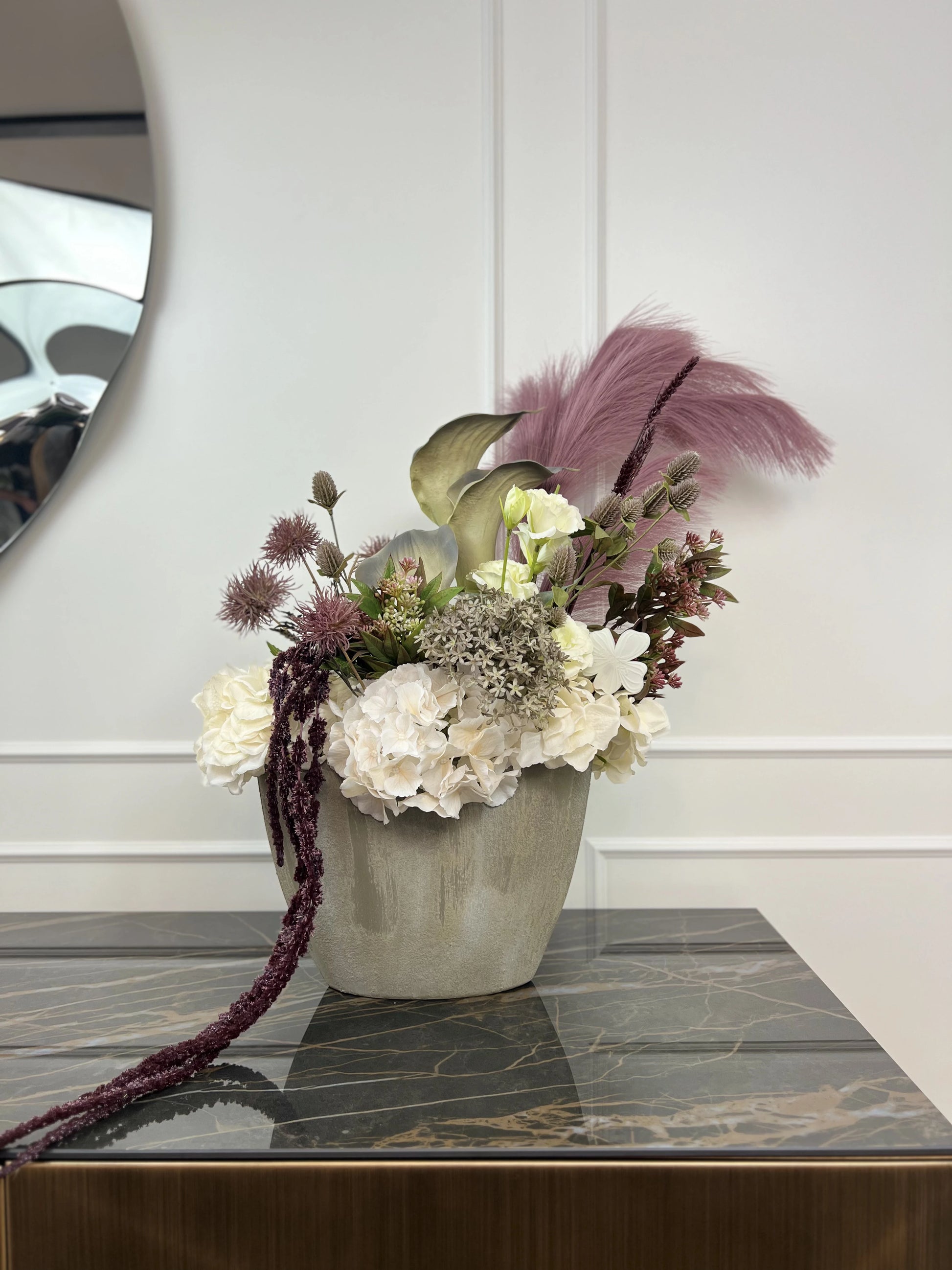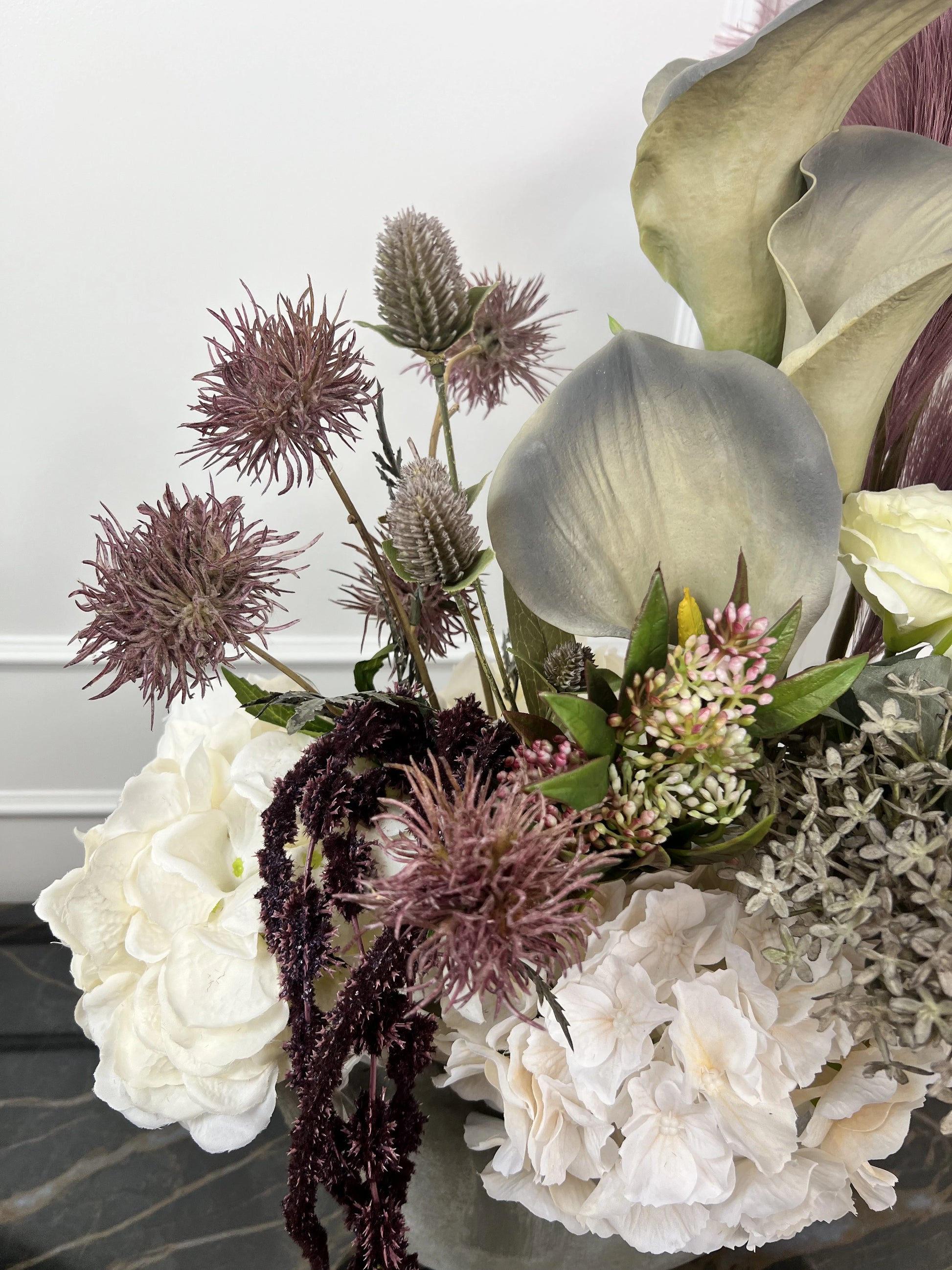 Un bouquet puissant et texturé, aux nuances chaudes et naturelles. Les cinq hortensias crème forment une base généreuse, sublimée par le calotropis et le lisianthus crème. Les accents bordeaux de l’amarante et les tons mauves de l’hamamelis apportent profondeur et caractère. Les épis de blé, la pampa XXL et les callas élancés viennent structurer l’ensemble avec élégance. Baiser d'éclat incarne l’alliance parfaite entre force végétale et poésie brute.