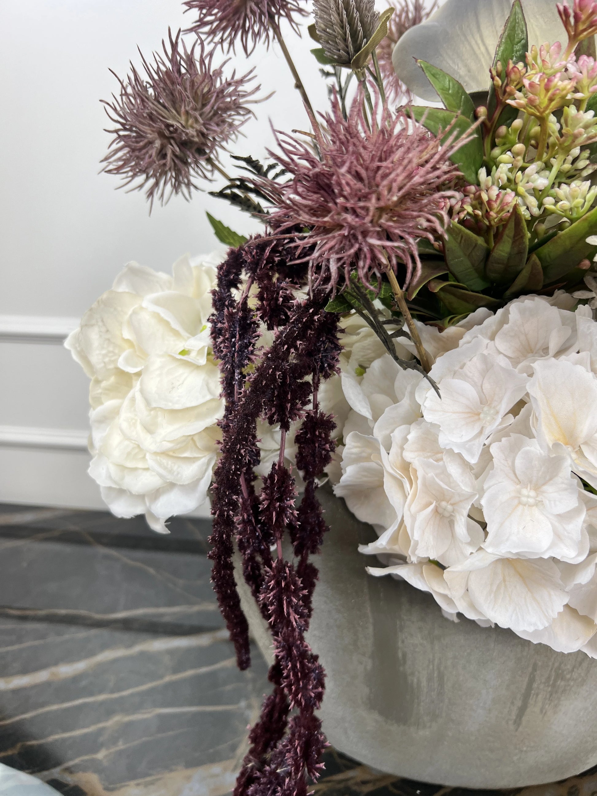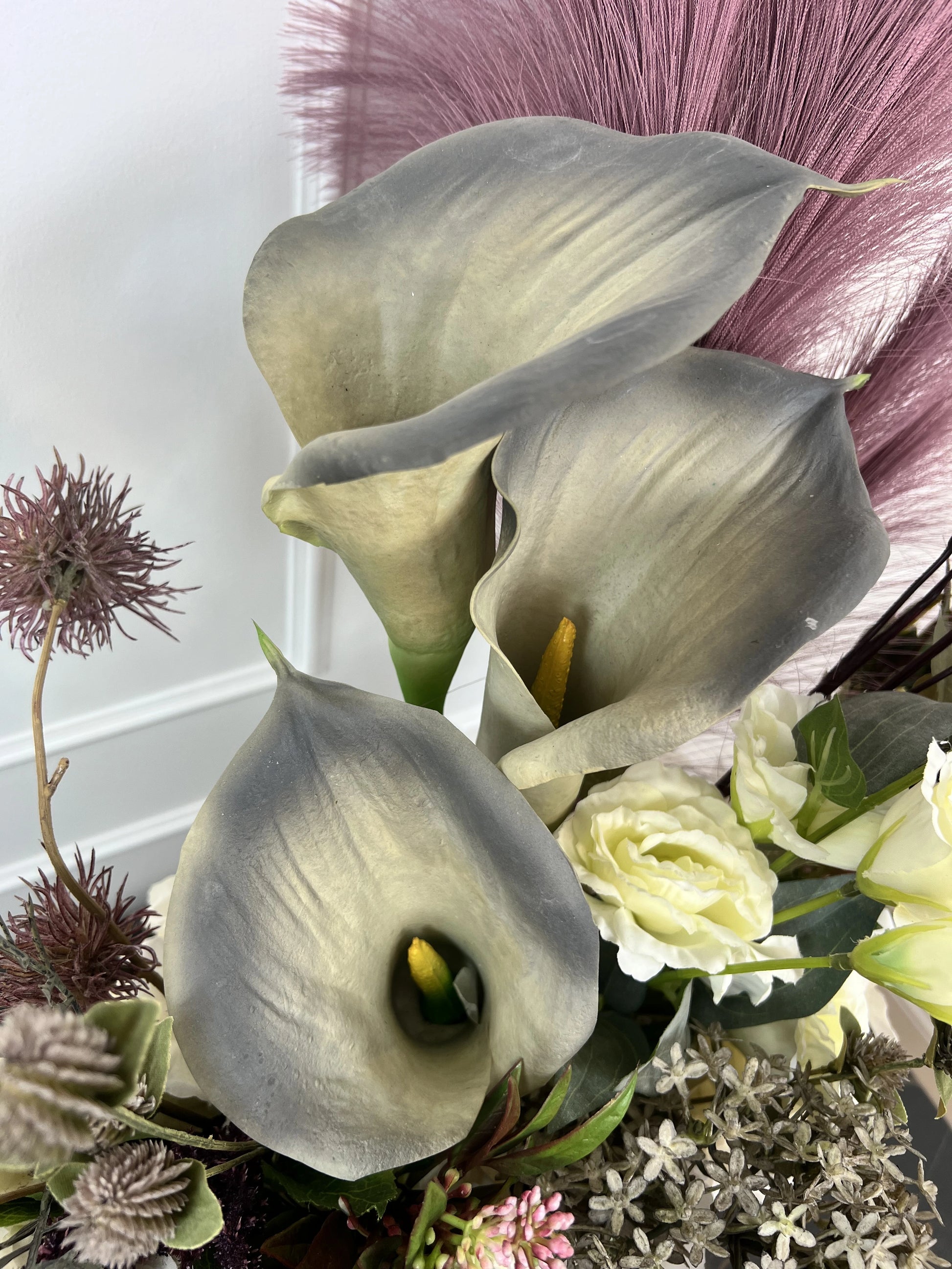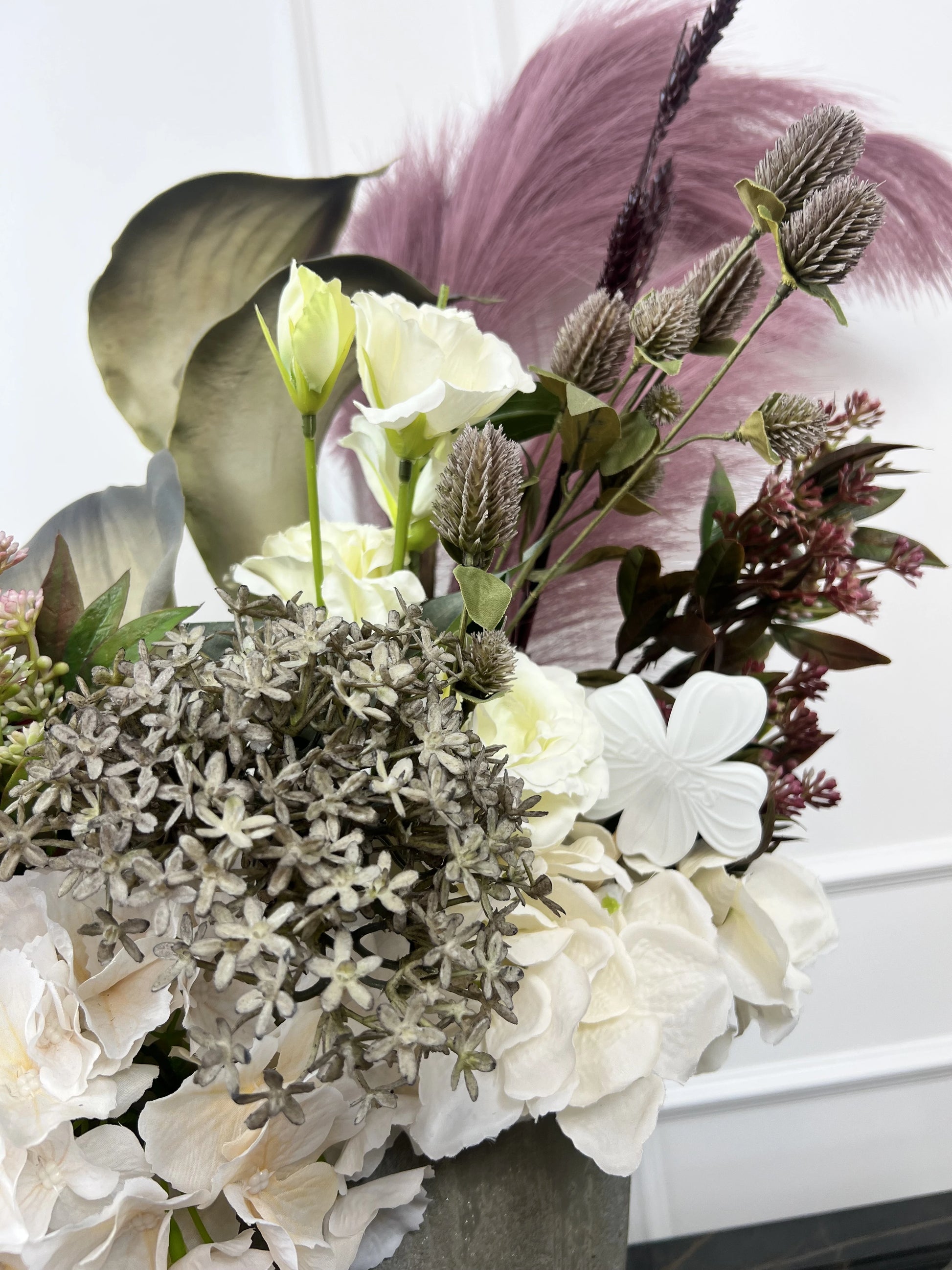 Un bouquet puissant et texturé, aux nuances chaudes et naturelles. Les cinq hortensias crème forment une base généreuse, sublimée par le calotropis et le lisianthus crème. Les accents bordeaux de l’amarante et les tons mauves de l’hamamelis apportent profondeur et caractère. Les épis de blé, la pampa XXL et les callas élancés viennent structurer l’ensemble avec élégance. Baiser d'éclat incarne l’alliance parfaite entre force végétale et poésie brute.
