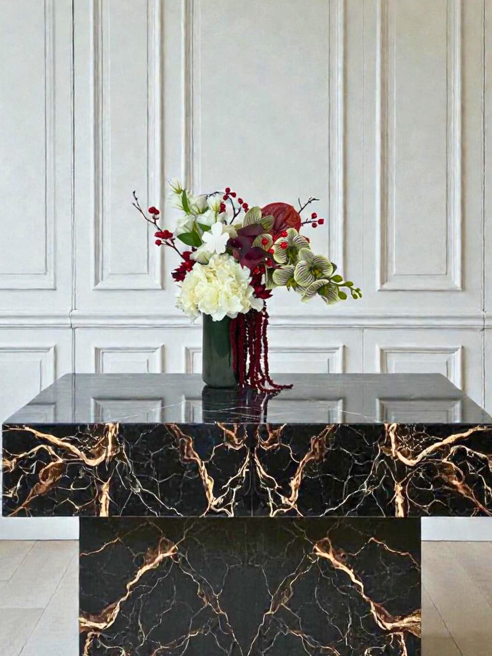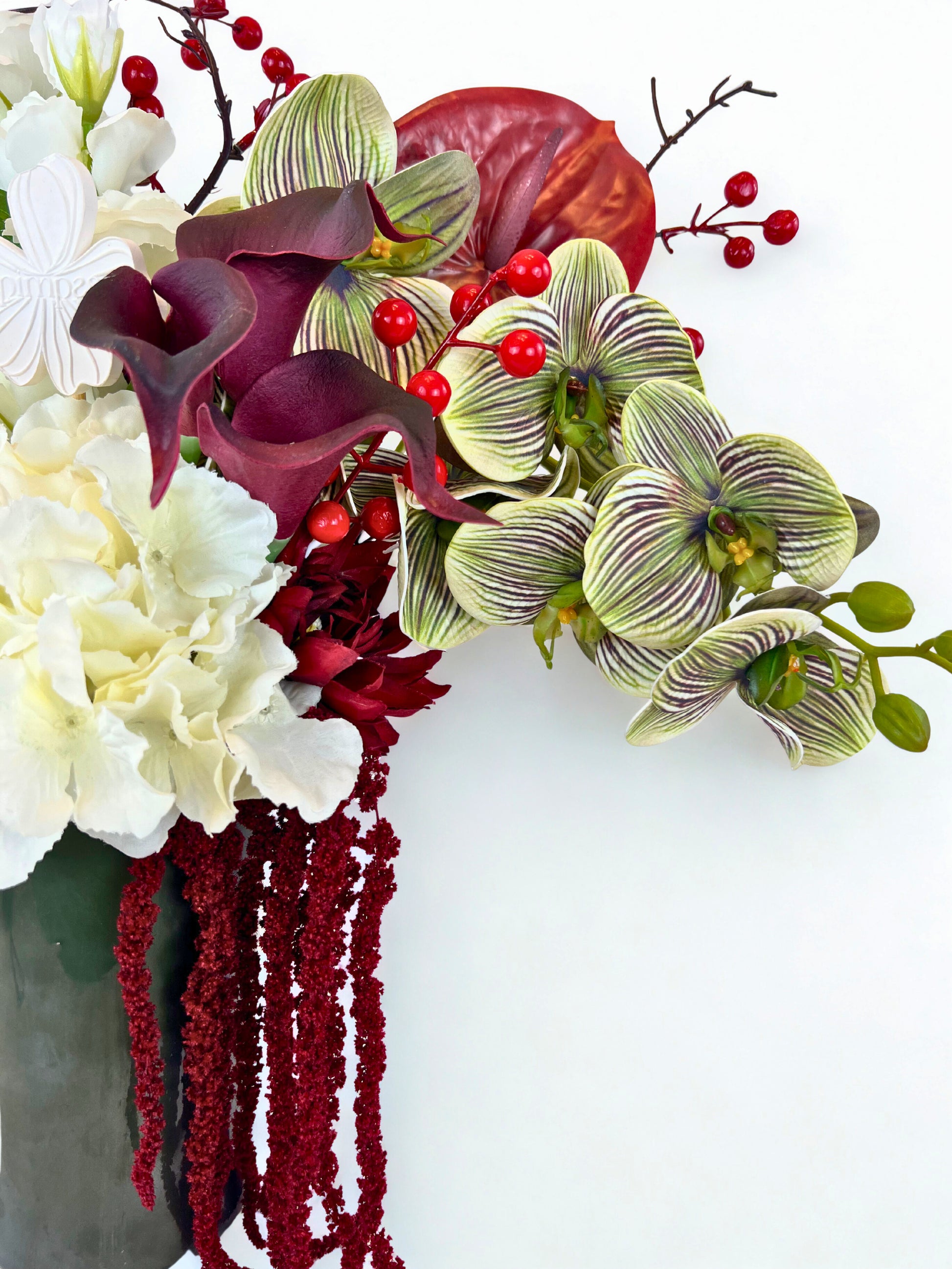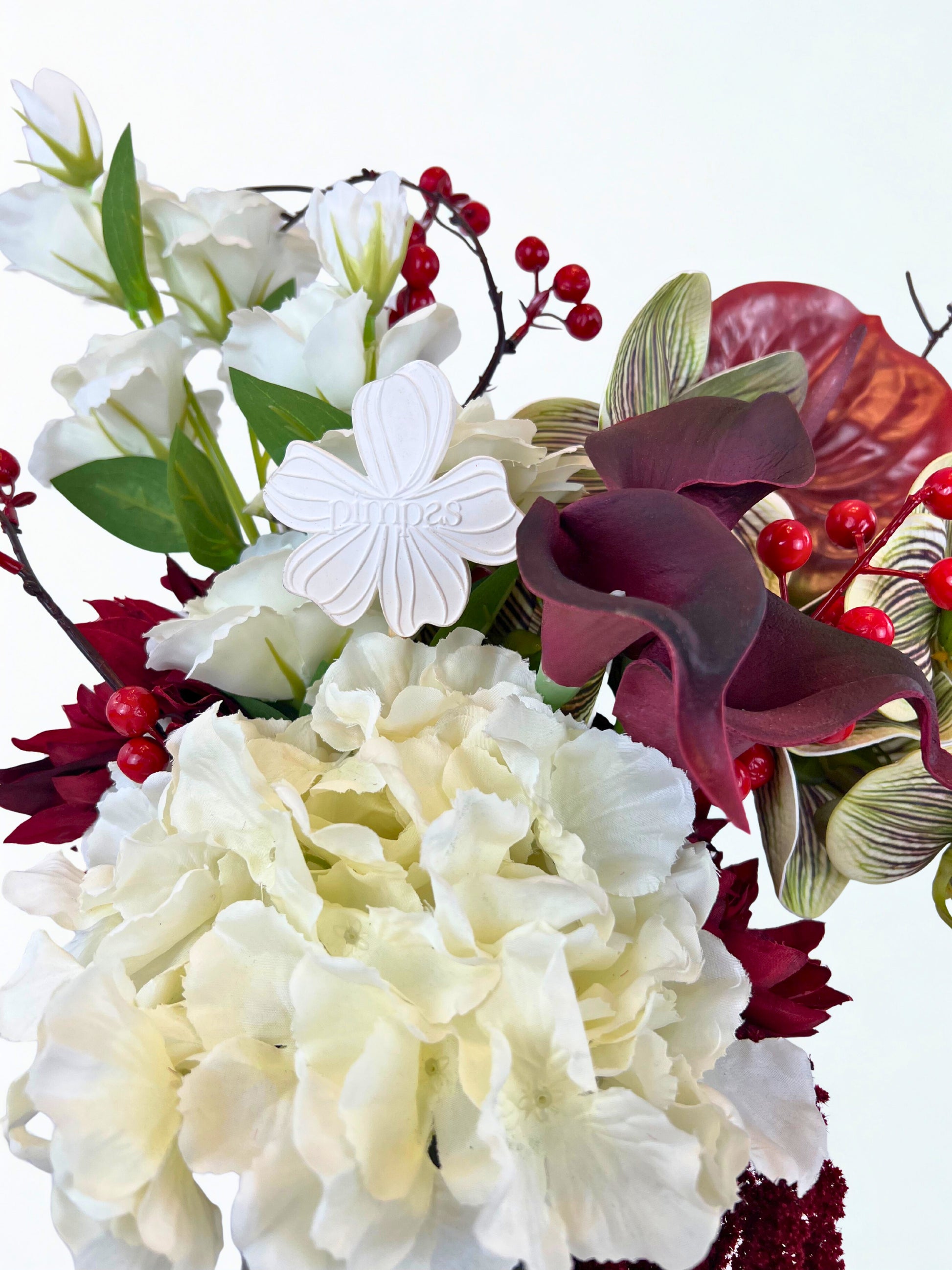 Un bouquet élégant et contrasté, suspendu entre légèreté florale et profondeur envoûtante. Les lysianthus, d’un blanc pur et aérien, ouvrent la composition avec délicatesse, tandis que les calas et le chrysanthème bordeaux déploient leurs courbes généreuses dans un souffle intense et velouté. L’orchidée striée, aux lignes graphiques, ajoute une sophistication subtile. L’hortensia apporte son volume cotonneux, contrebalancé par les baies qui ponctuent le bouquet de notes vives. L’amarante tombante crée un mouvement sensuel, comme un voile qui glisse. Brume Grenat est une rencontre entre douceur immaculée et passion sombre, un jeu d’équilibre entre ombre et lumière.