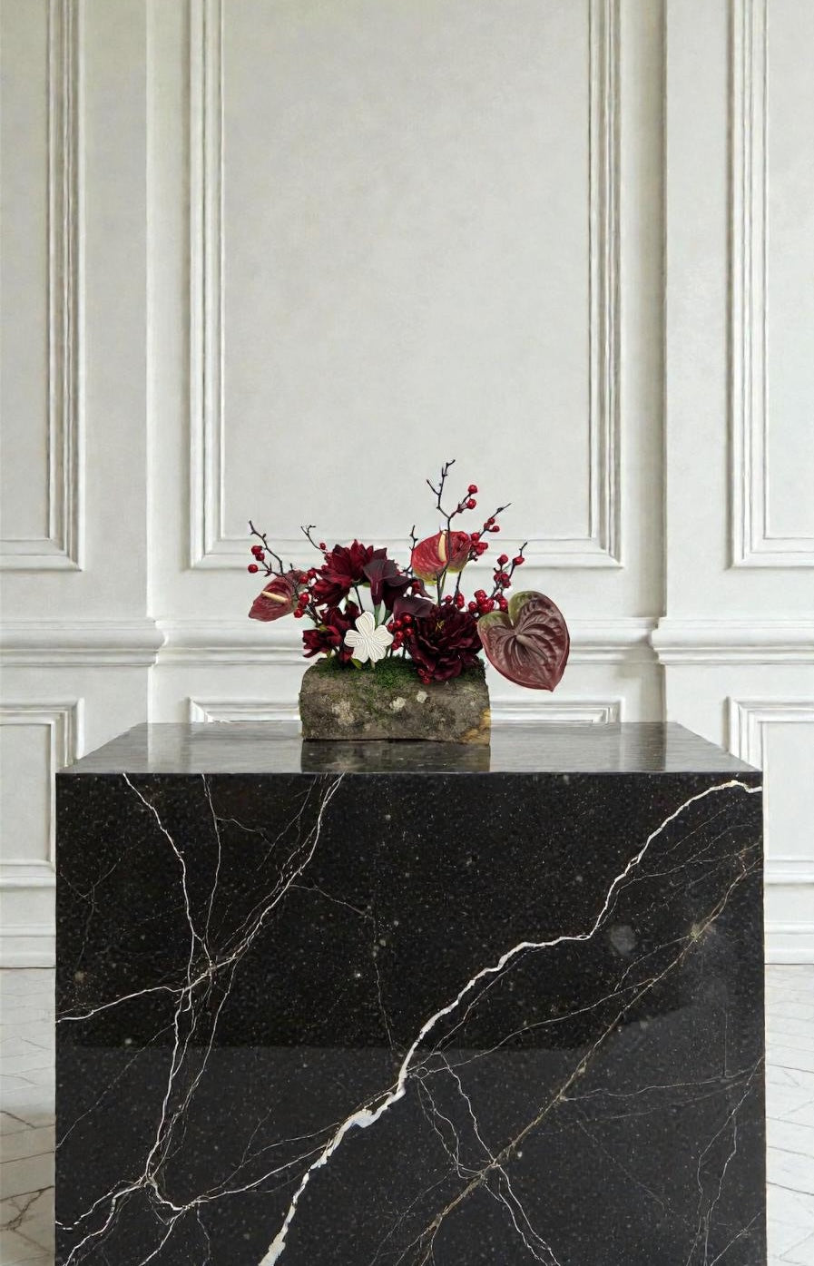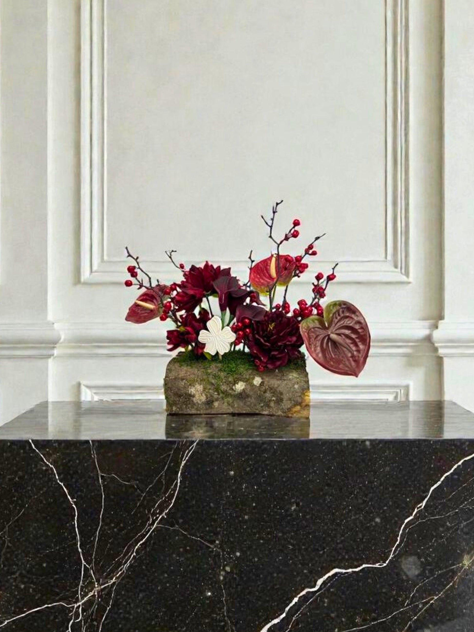 Une création chaleureuse et sculpturale, posée sur un socle de mousse comme sortie d’un sous-bois enchanté. La pivoine bordeaux, au cœur du bouquet, irradie de sensualité, entourée par les chrysanthèmes au rouge profond et les calas au galbe velouté. Les anthuriums, aux reflets laqués, ajoutent une touche contemporaine et vibrante. Les branches de baies écarlates insufflent rythme et vitalité, comme des perles de givre prêtes à éclore. Bûche d’Hiver est une scène végétale captivante, entre intensité florale et naturel maîtrisé, une pièce forte qui évoque la magie feutrée des fêtes et la chaleur d’un hiver sous la neige.