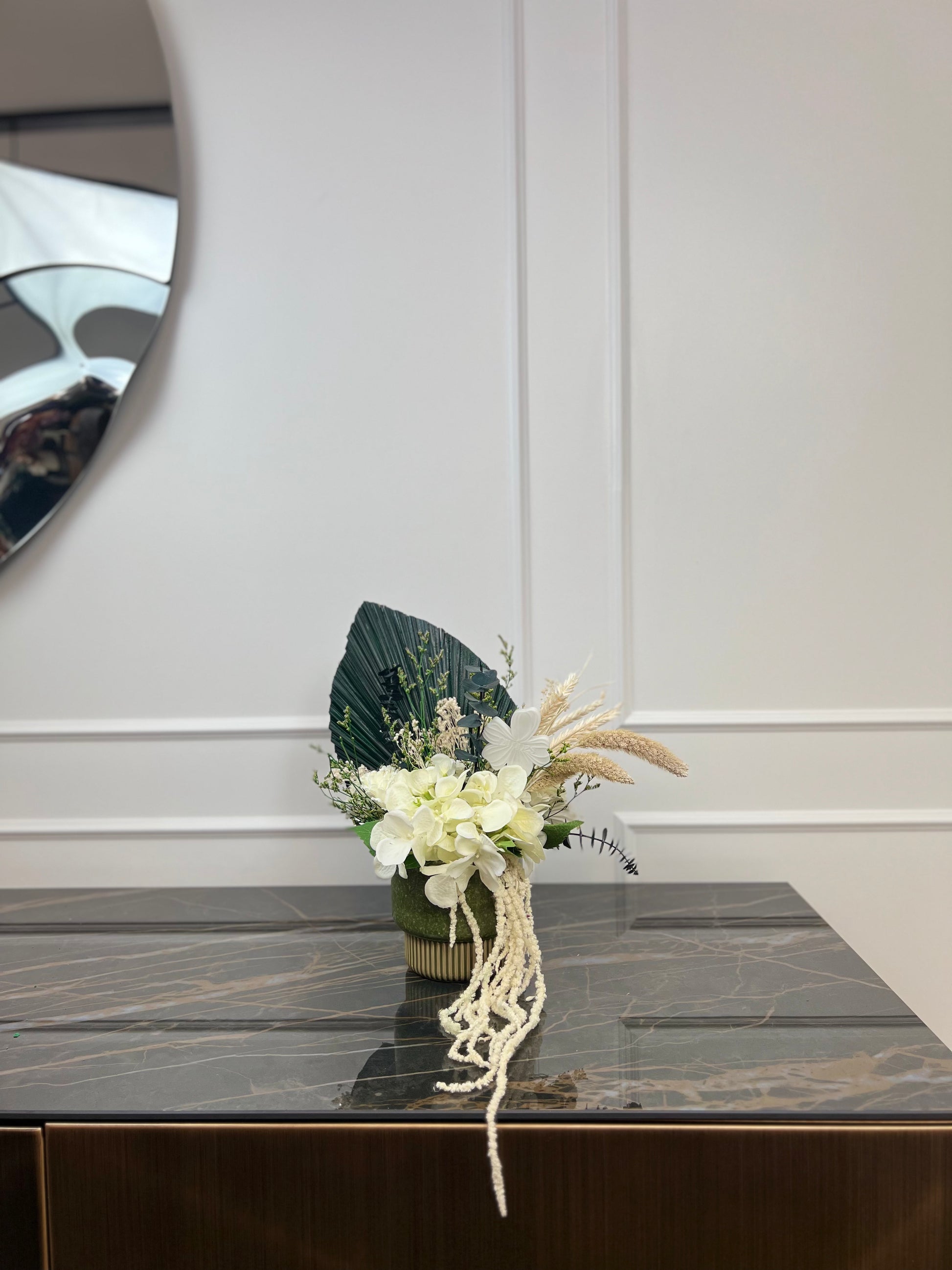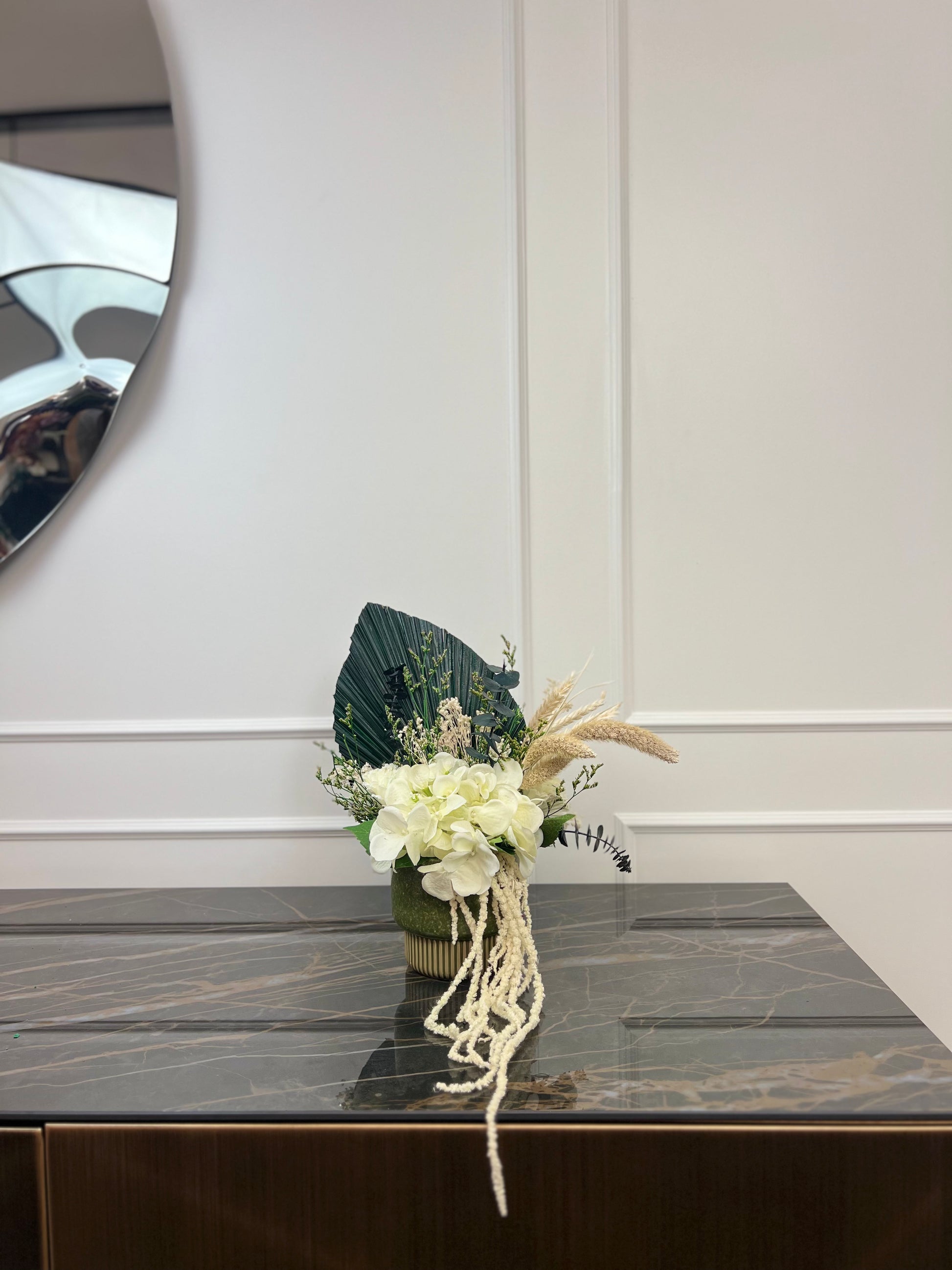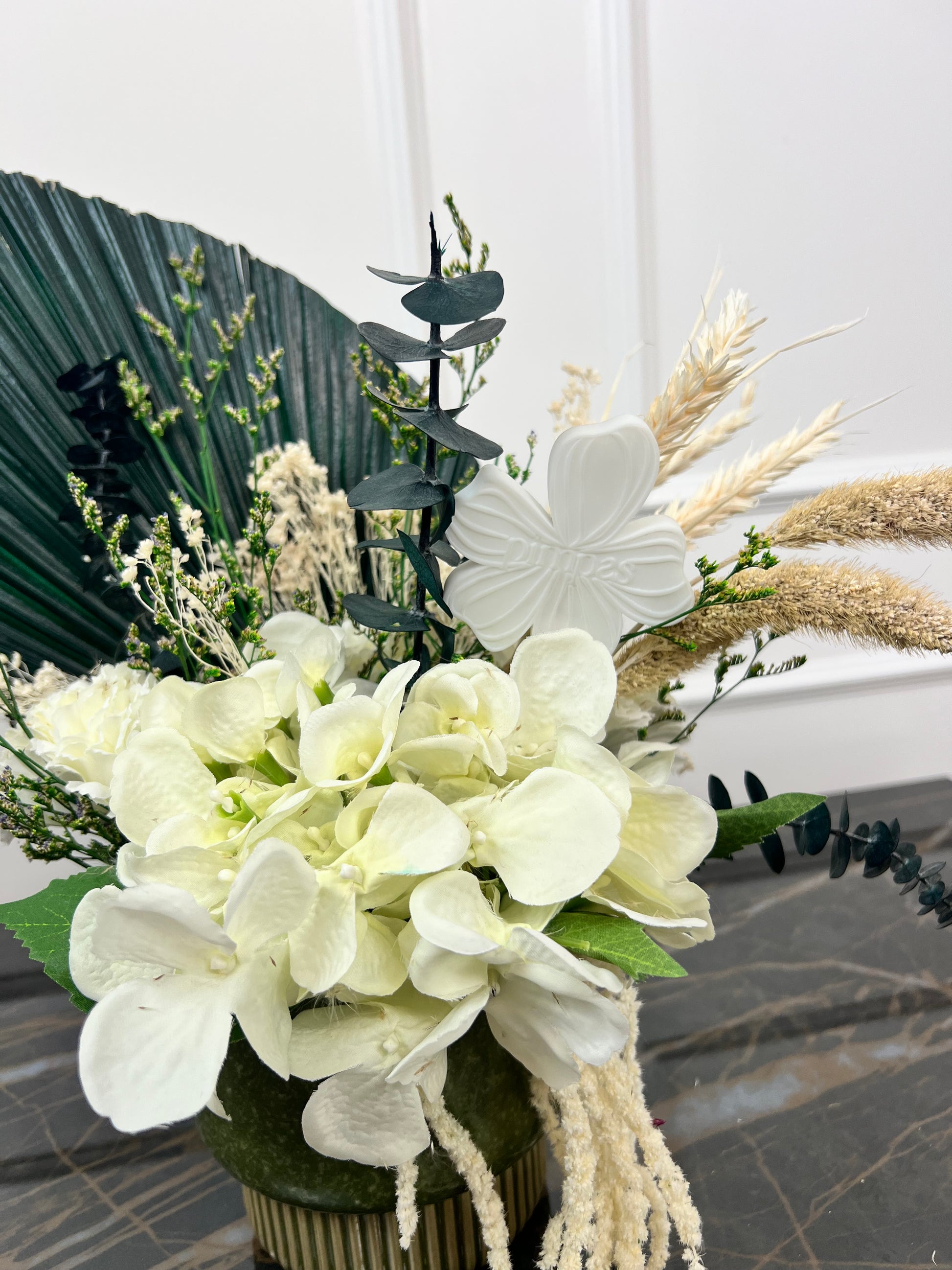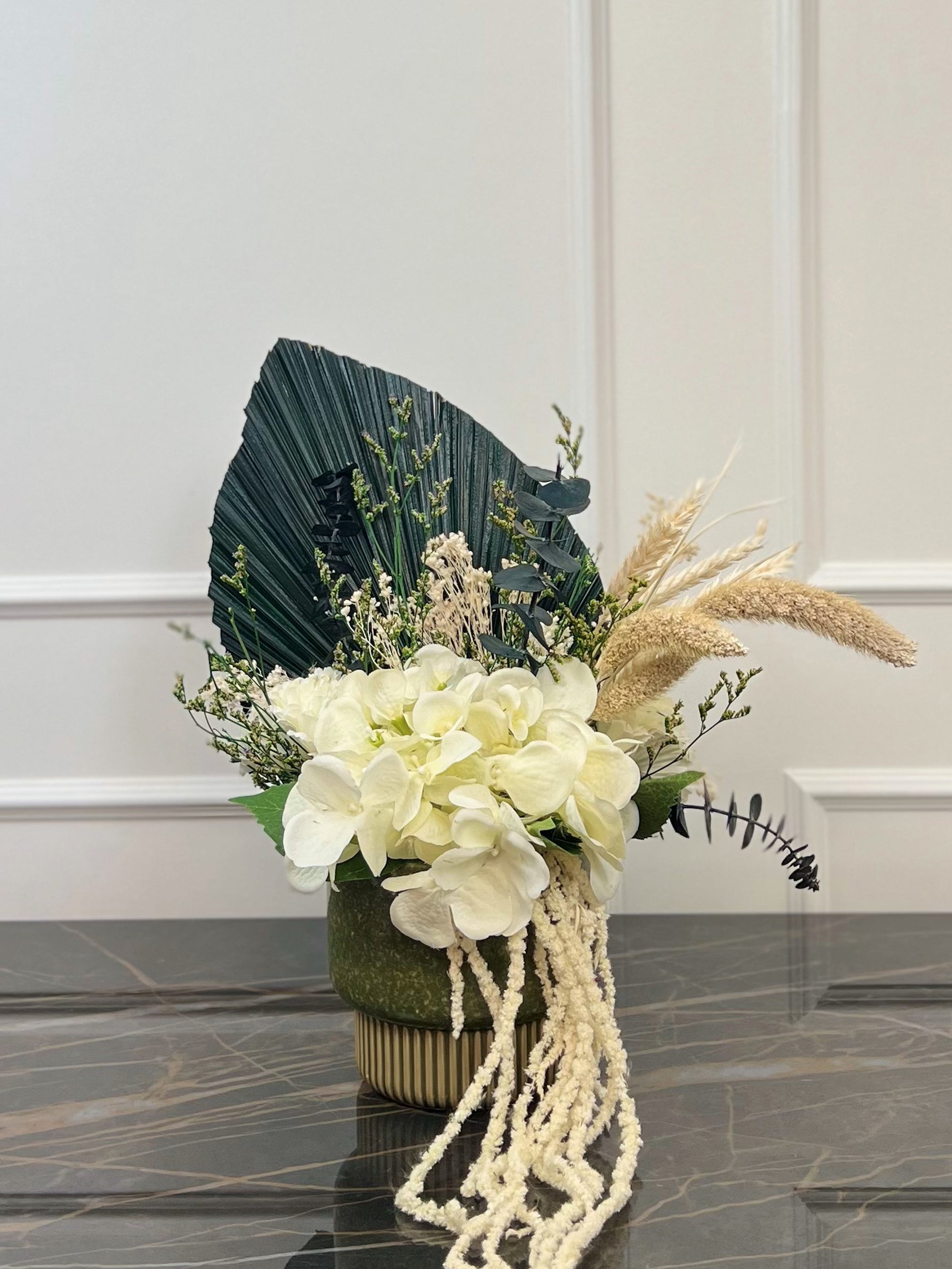 Herbes vagabondes est un bouquet de fleurs éternelles aux nuances douces de vert et de blanc. Hortensia blanche, eucalyptus, setaria et broom bloom crème s’unissent à l’amaranthe et aux épis de blé pour une composition légère et végétale, inspirée des grands espaces et de la beauté sauvage de la nature.