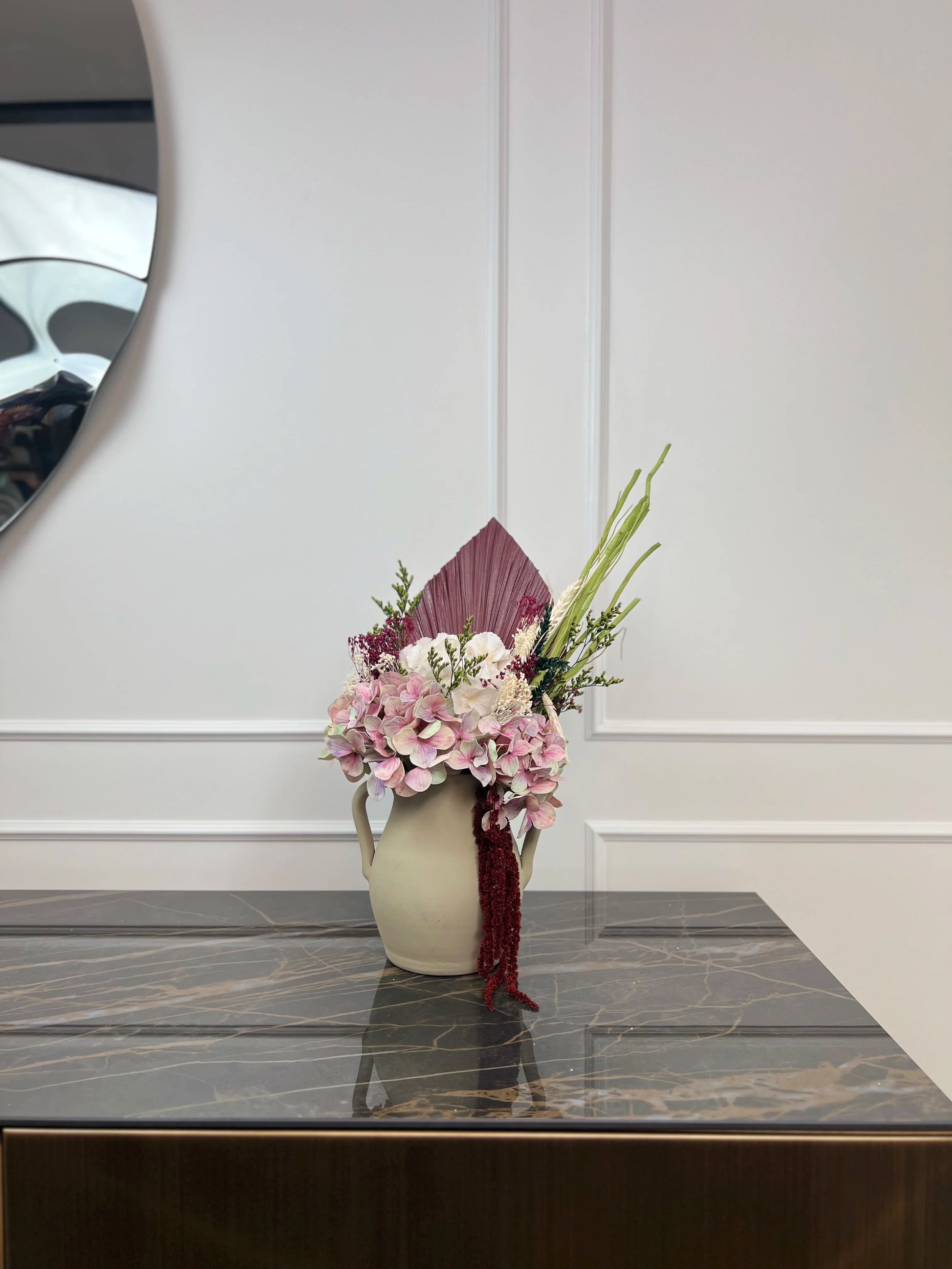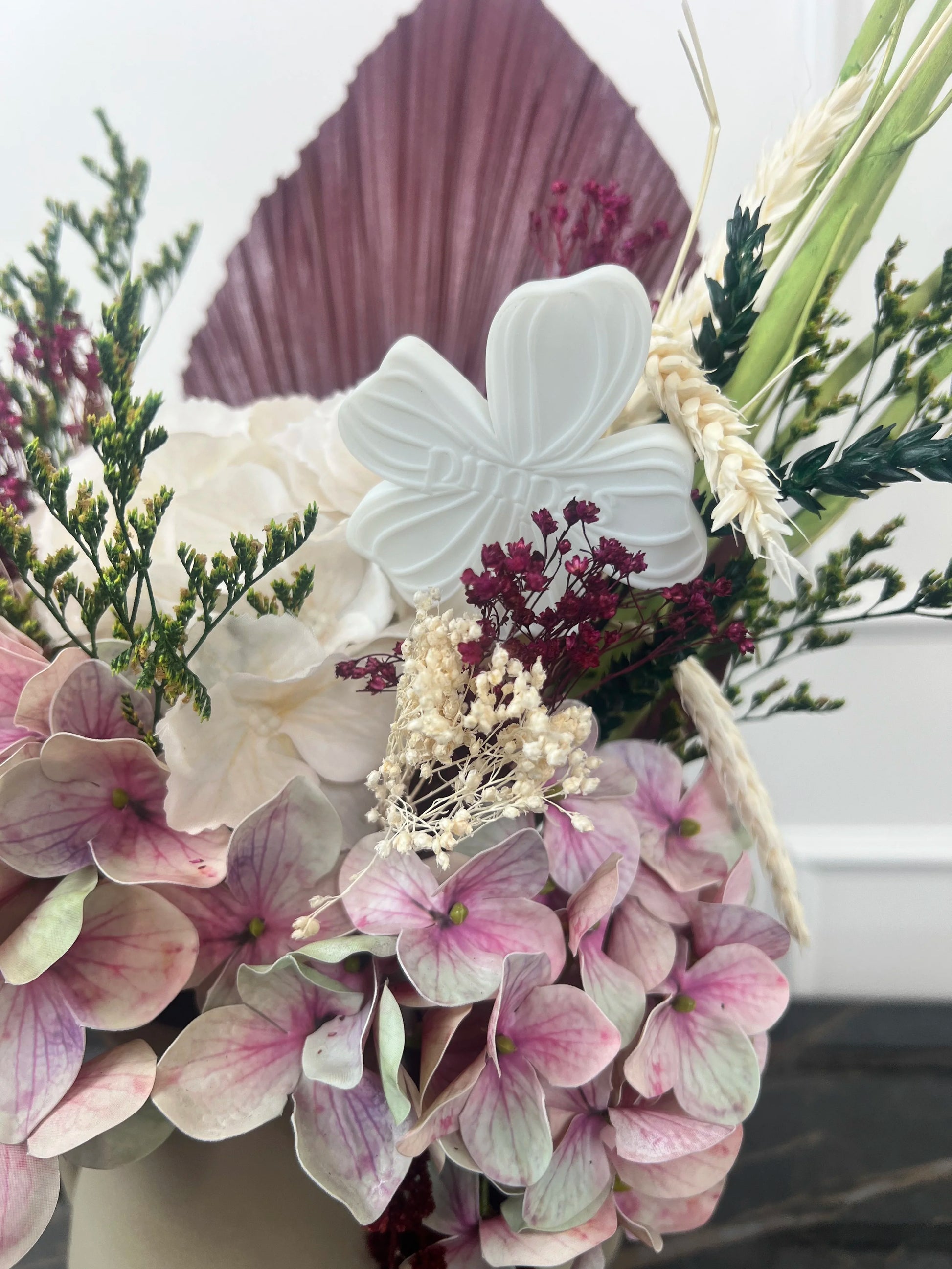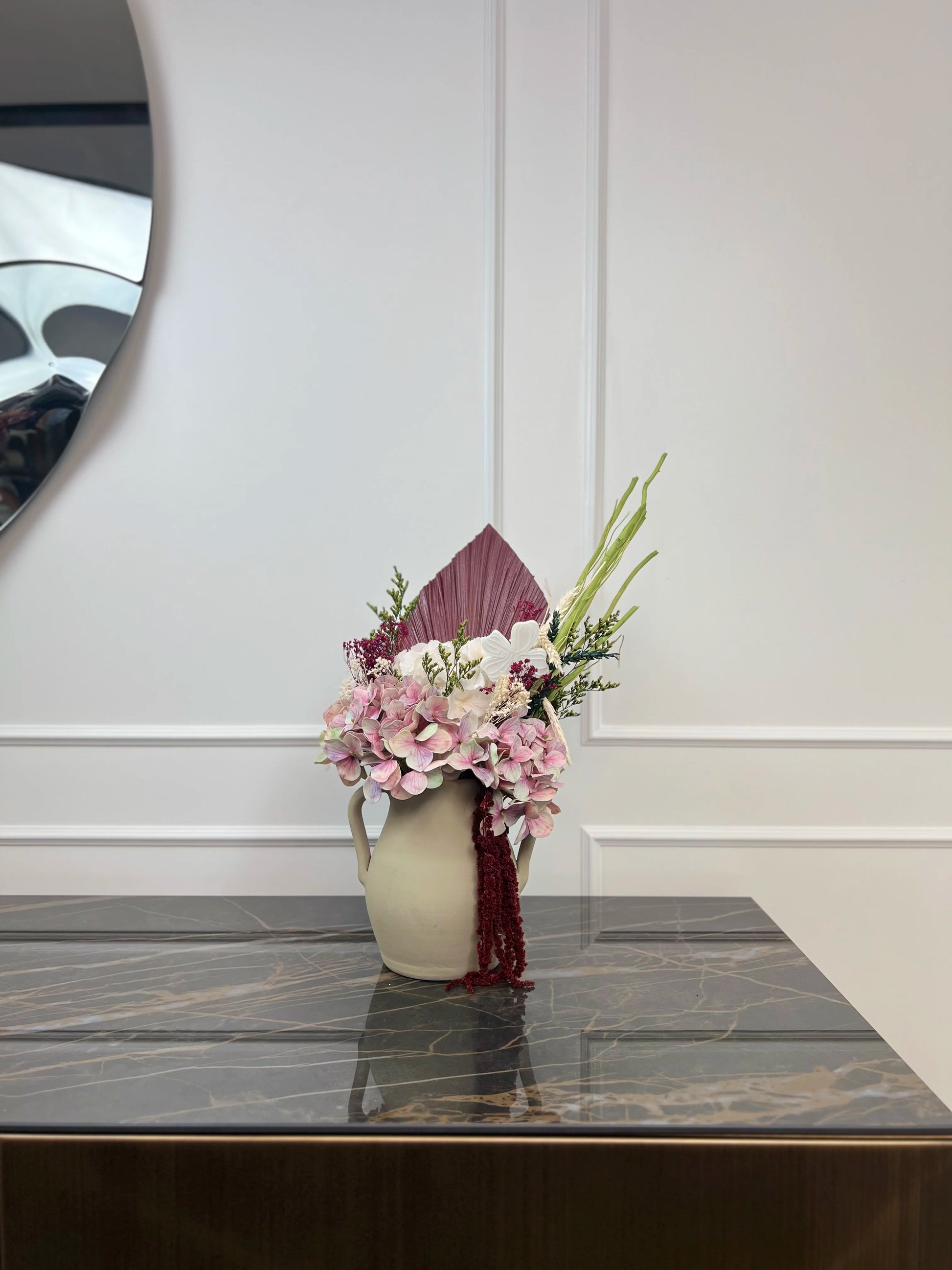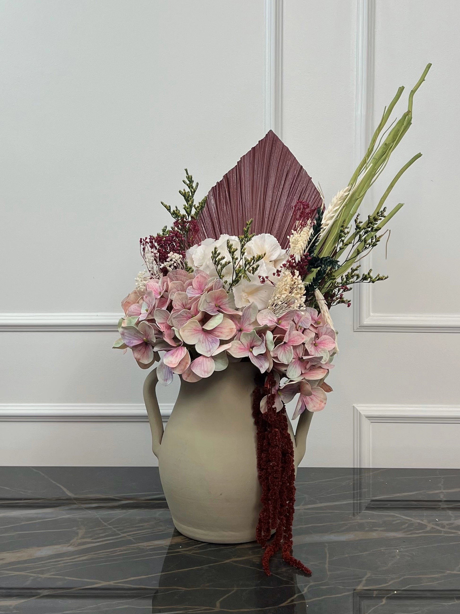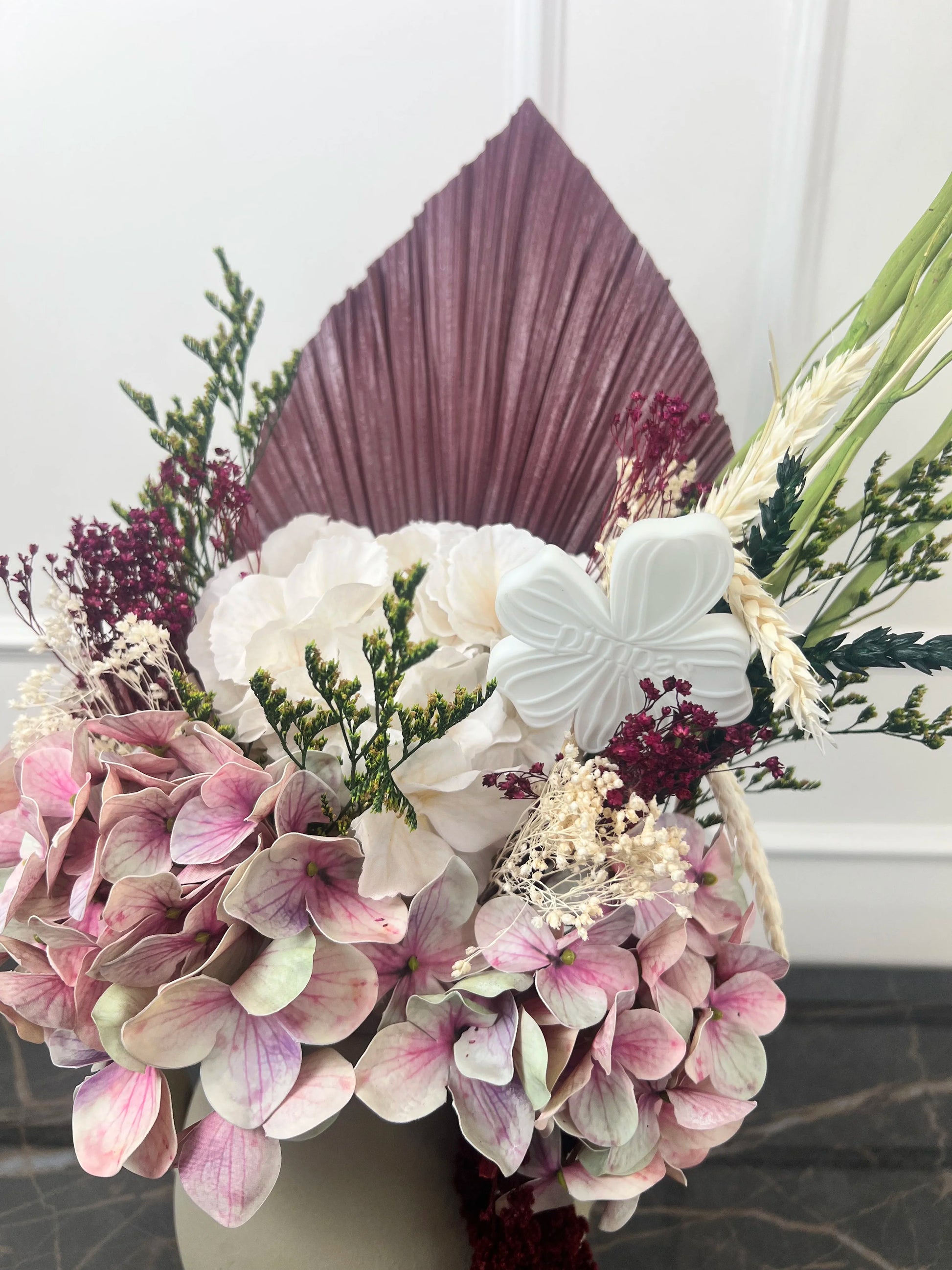 Une composition chaleureuse aux allures de fin d’été. Les hortensias rose et crème s’épanouissent au cœur d’un mélange subtil de broom bloom prune, vert et blanc. Les épis de blé, en version naturelle et blanchie, apportent une touche rustique et élégante. Le palmier et les branchages en bois viennent structurer le bouquet, lui donnant une présence à la fois douce et affirmée. Jardin secret capture l’essence d’une nature apaisée, entre matière et poésie.