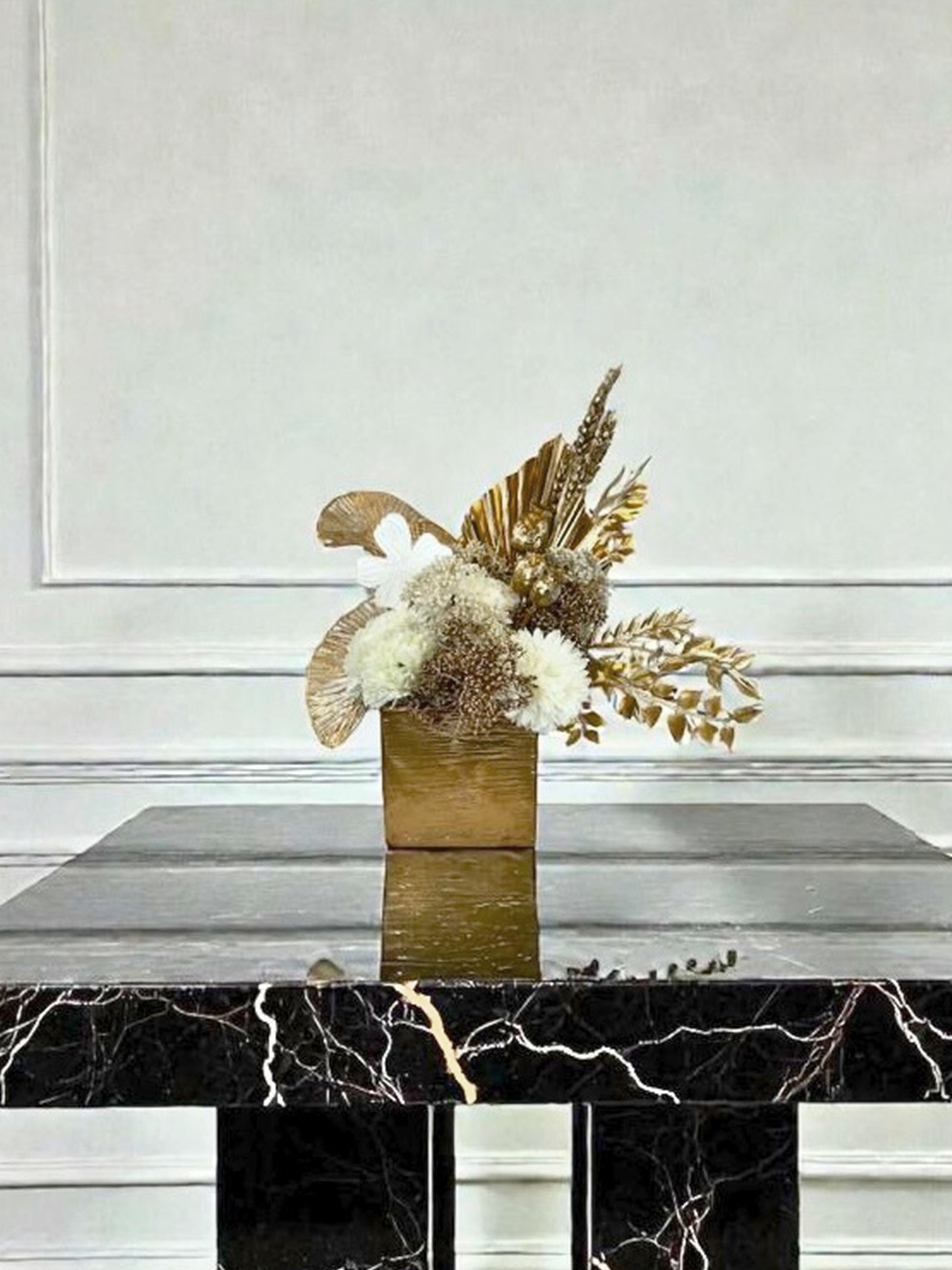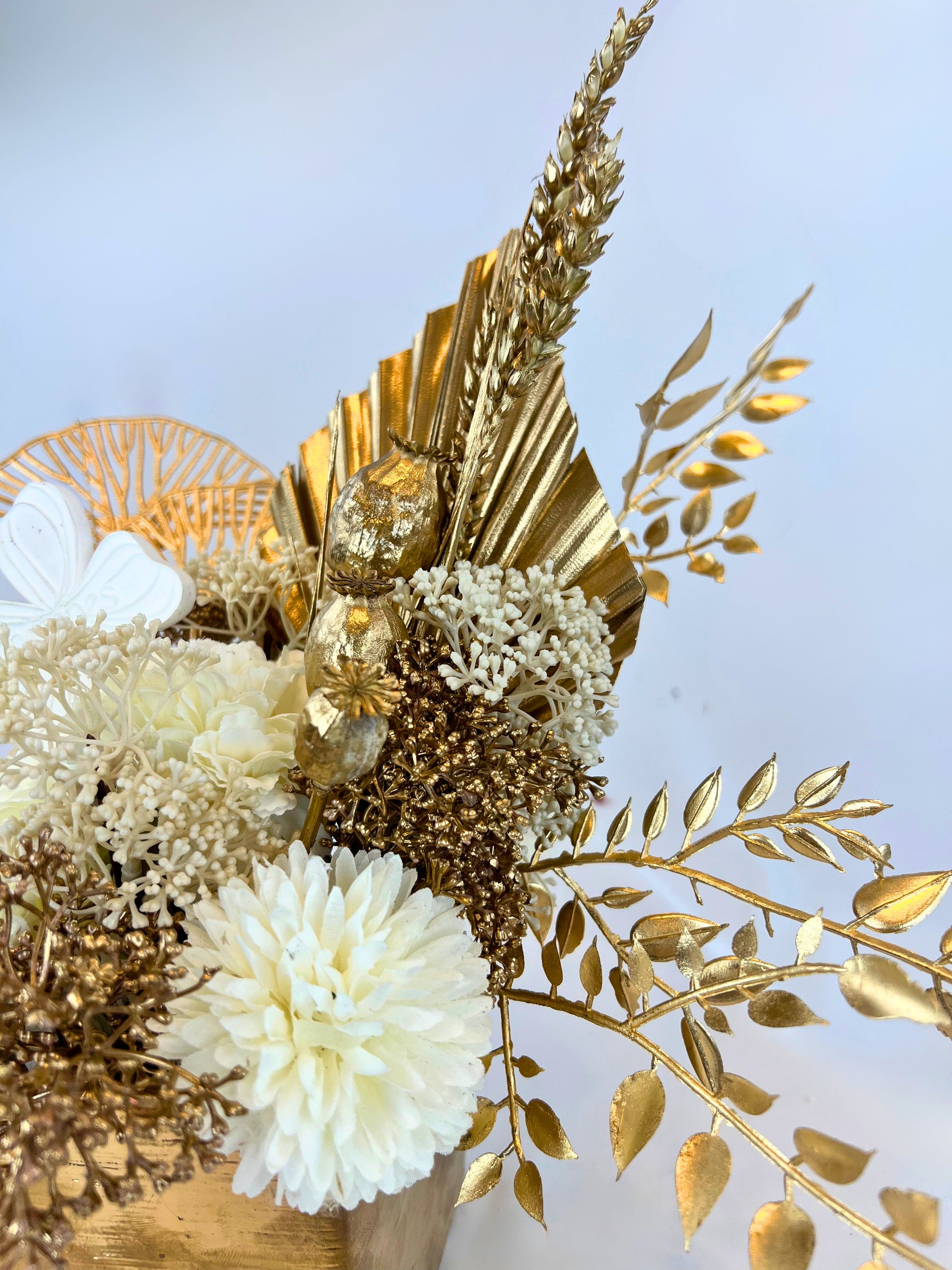 Un bouquet solaire à l’élégance intemporelle, où chaque tige évoque une poésie dorée. Les œillets dévoilent leur charme classique avec une douceur soyeuse, tandis que l’avoine et les épis de blé insufflent un esprit champêtre, baigné de lumière. Le ginkgo, symbole de sagesse, se mêle au pavot pour créer un équilibre entre finesse et caractère. Le ruscus doré pare l’ensemble d’un éclat précieux, tel un bijou végétal, et la feuille de palmier apporte une touche graphique, résolument moderne. Muse Dorée est une ode à la lumière, à la nature sublimée et à l’élégance brute.