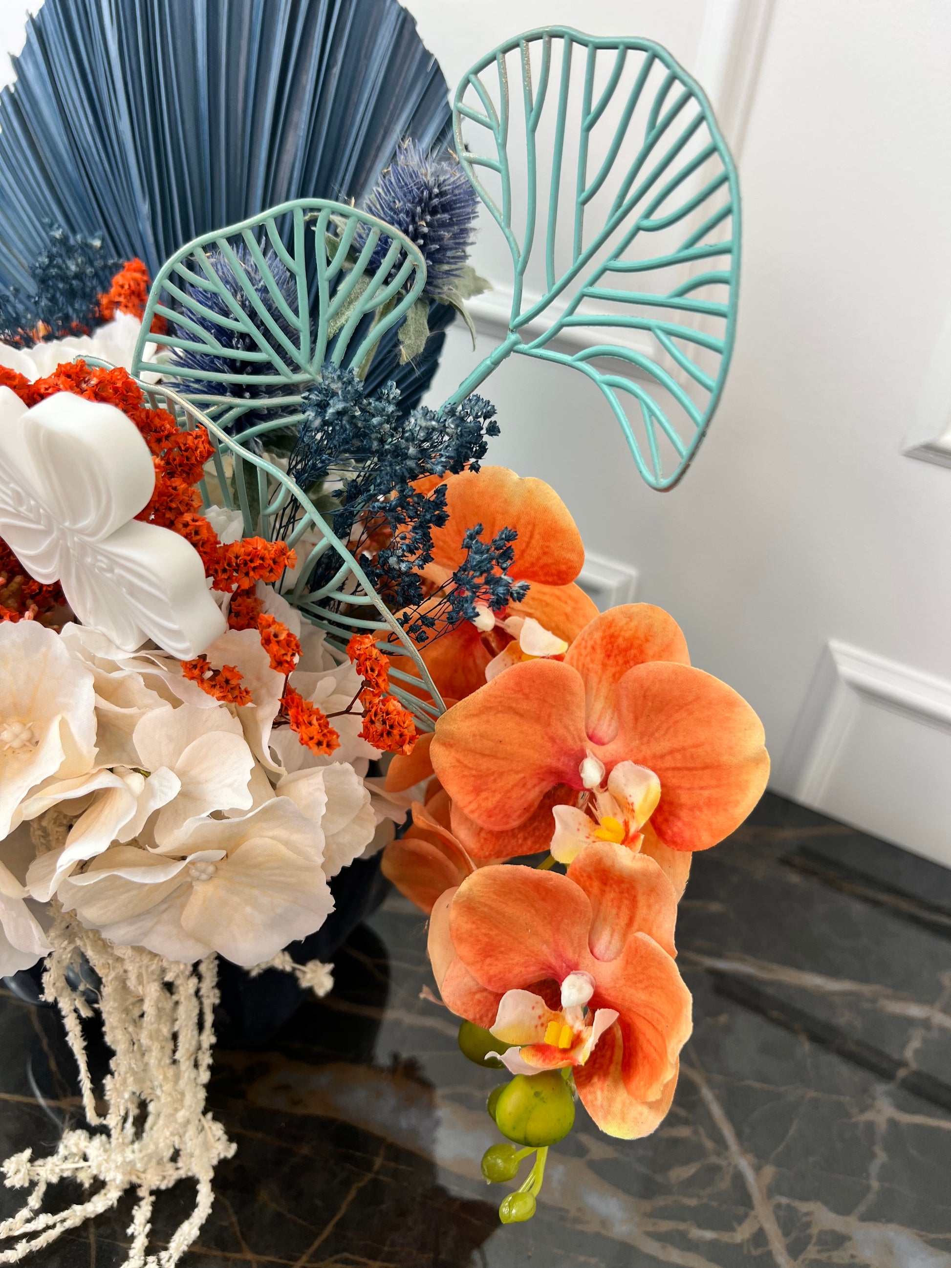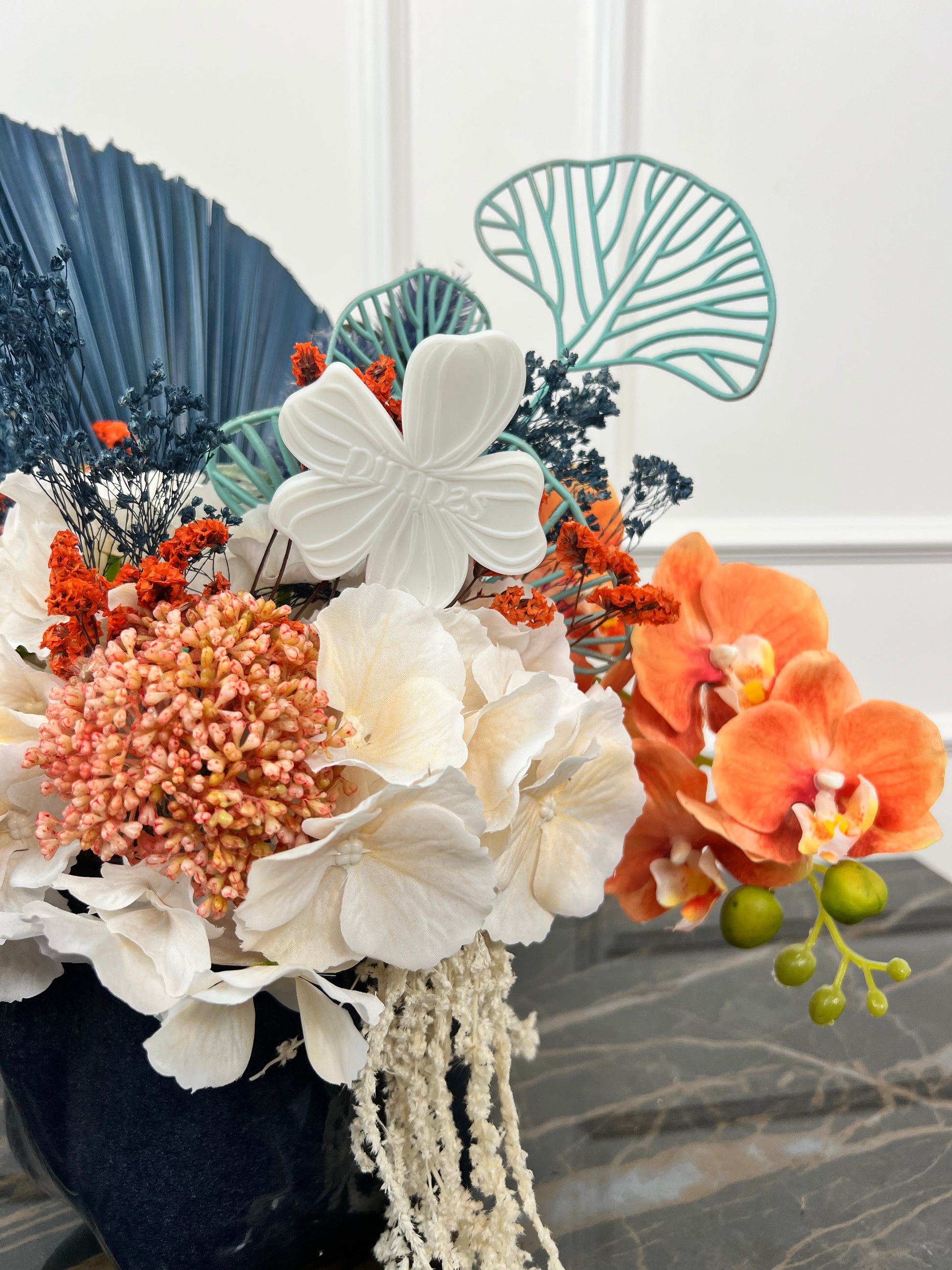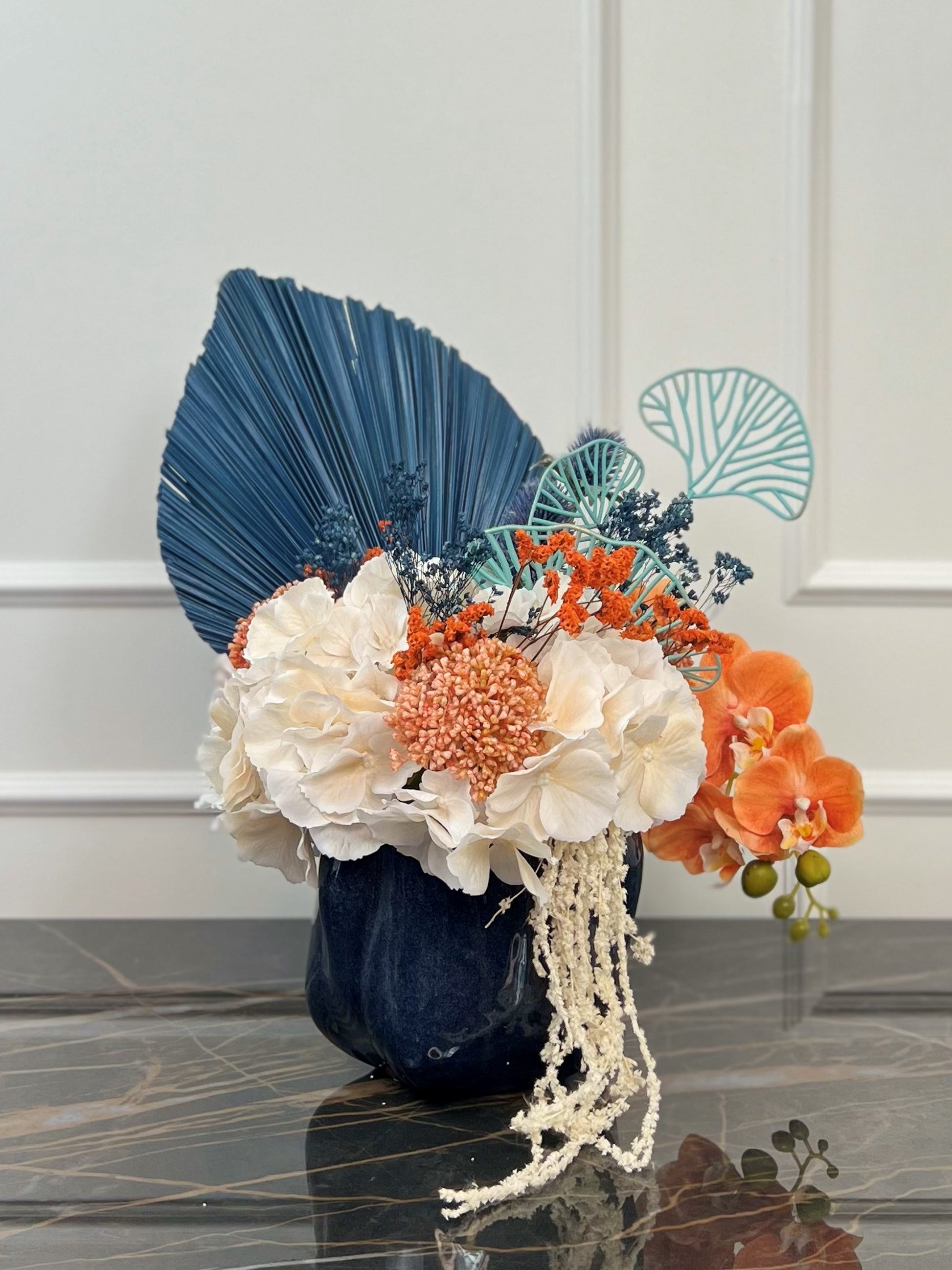 Oasis fleurie est un bouquet de fleurs éternelles qui mêle douceur et vitalité. Hortensias blancs, fleurs d’avoine et orchidée orange vibrante s’accordent aux touches légères de broom bloom, d’amaranthe tombante blanche et de feuillages cyan. Une grande feuille de palmier bleu marine structure la composition, apportant du contraste et de la profondeur. Le tout est présenté dans un élégant vase en céramique bleu marine, pour une création fraîche, chaleureuse et résolument contemporaine.