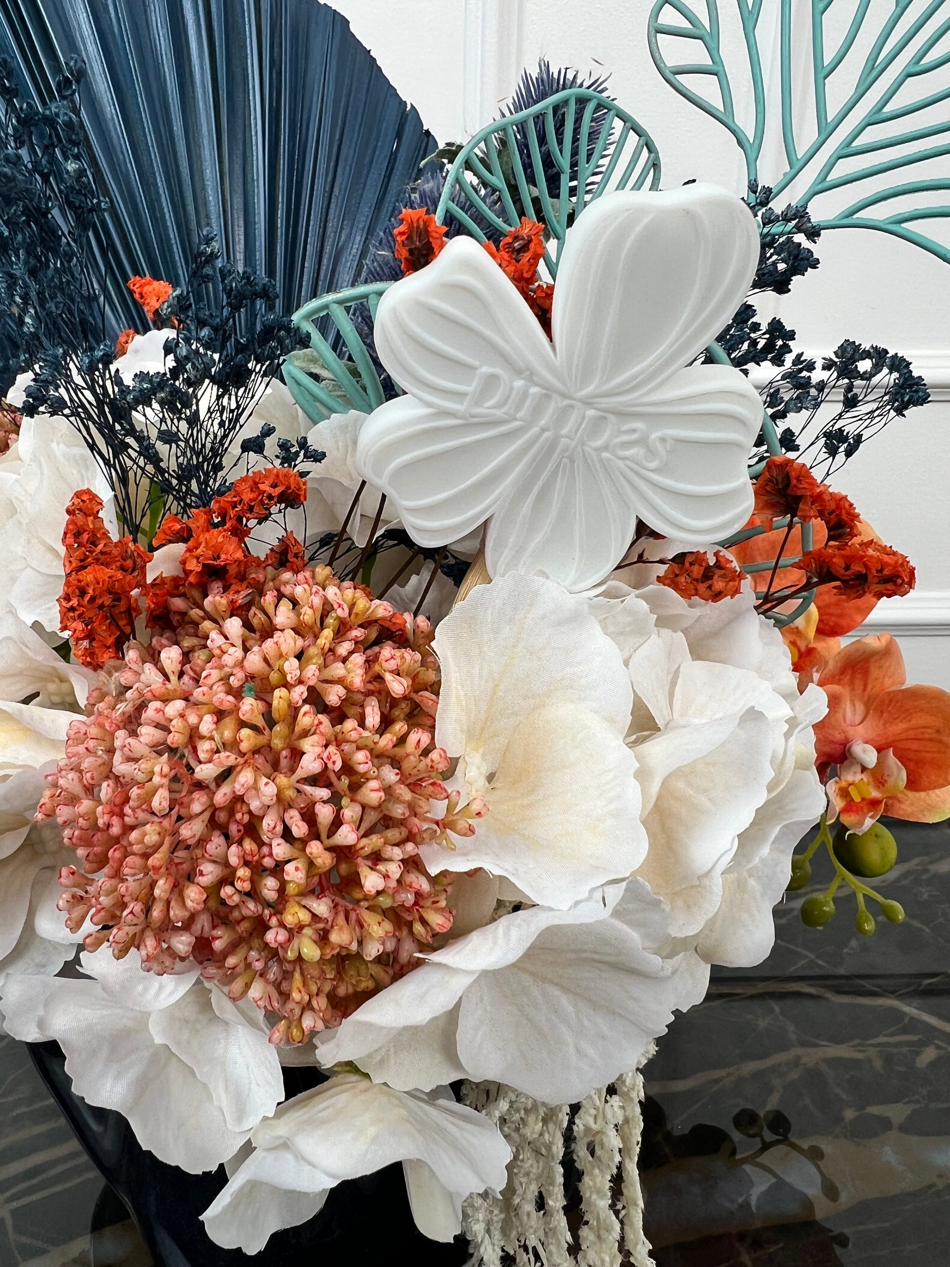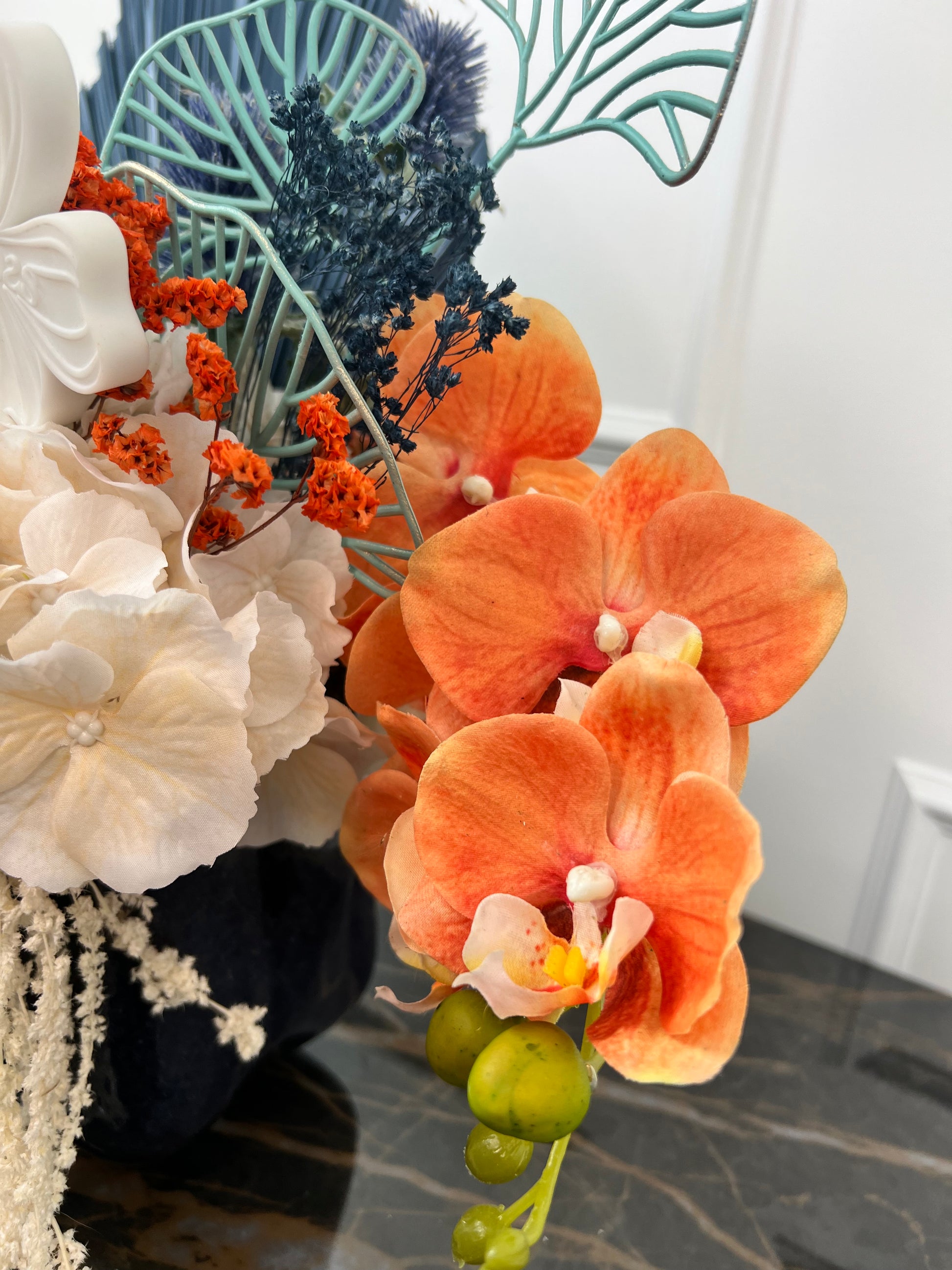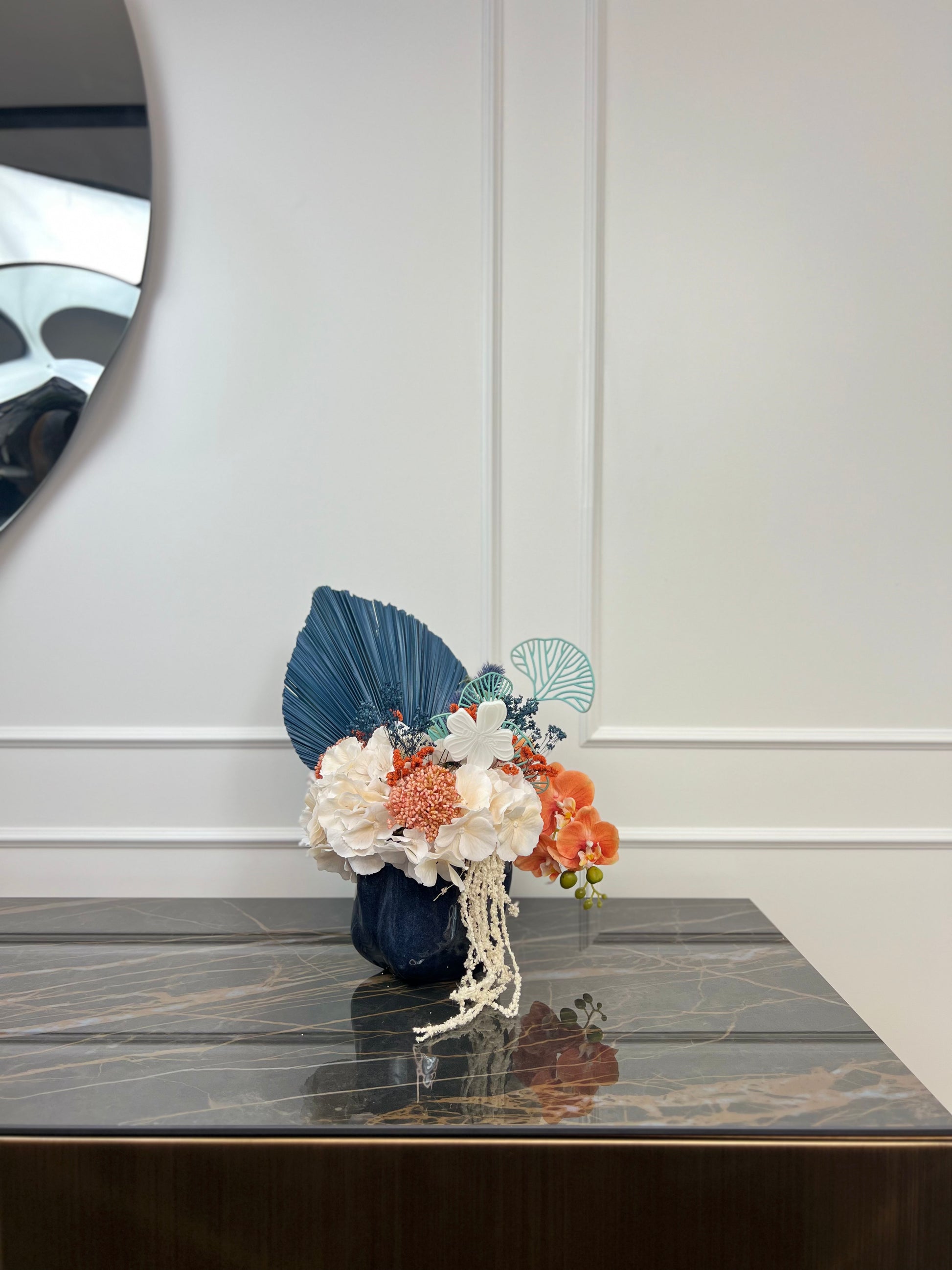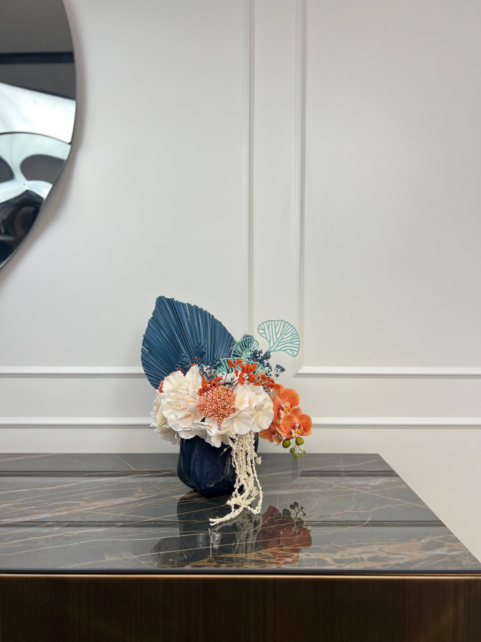 Oasis fleurie est un bouquet de fleurs éternelles qui mêle douceur et vitalité. Hortensias blancs, fleurs d’avoine et orchidée orange vibrante s’accordent aux touches légères de broom bloom, d’amaranthe tombante blanche et de feuillages cyan. Une grande feuille de palmier bleu marine structure la composition, apportant du contraste et de la profondeur. Le tout est présenté dans un élégant vase en céramique bleu marine, pour une création fraîche, chaleureuse et résolument contemporaine.