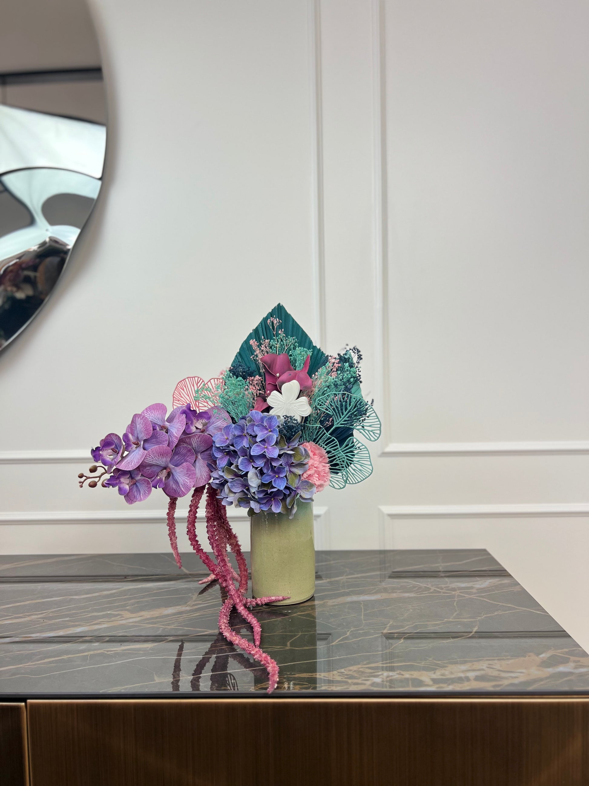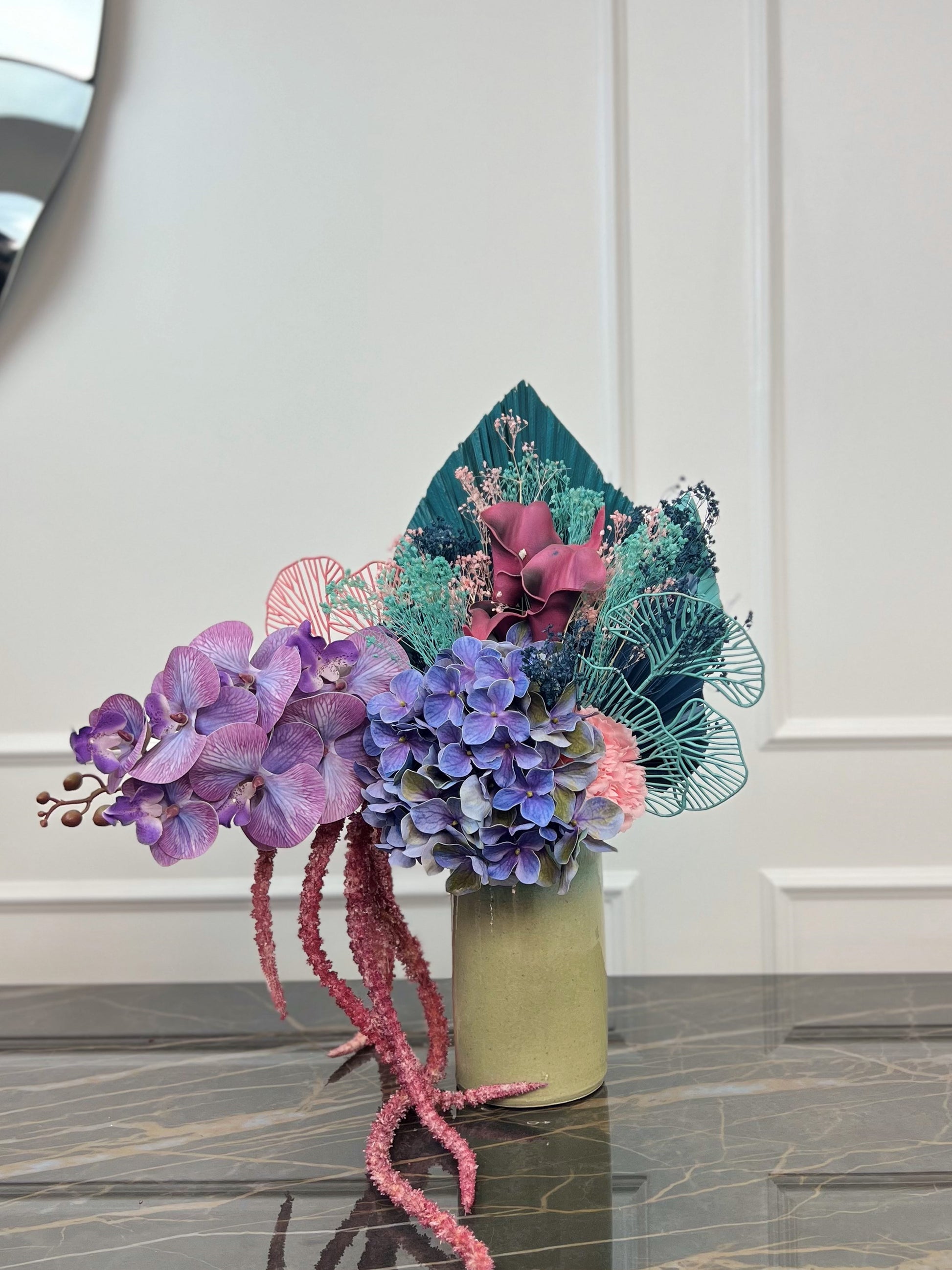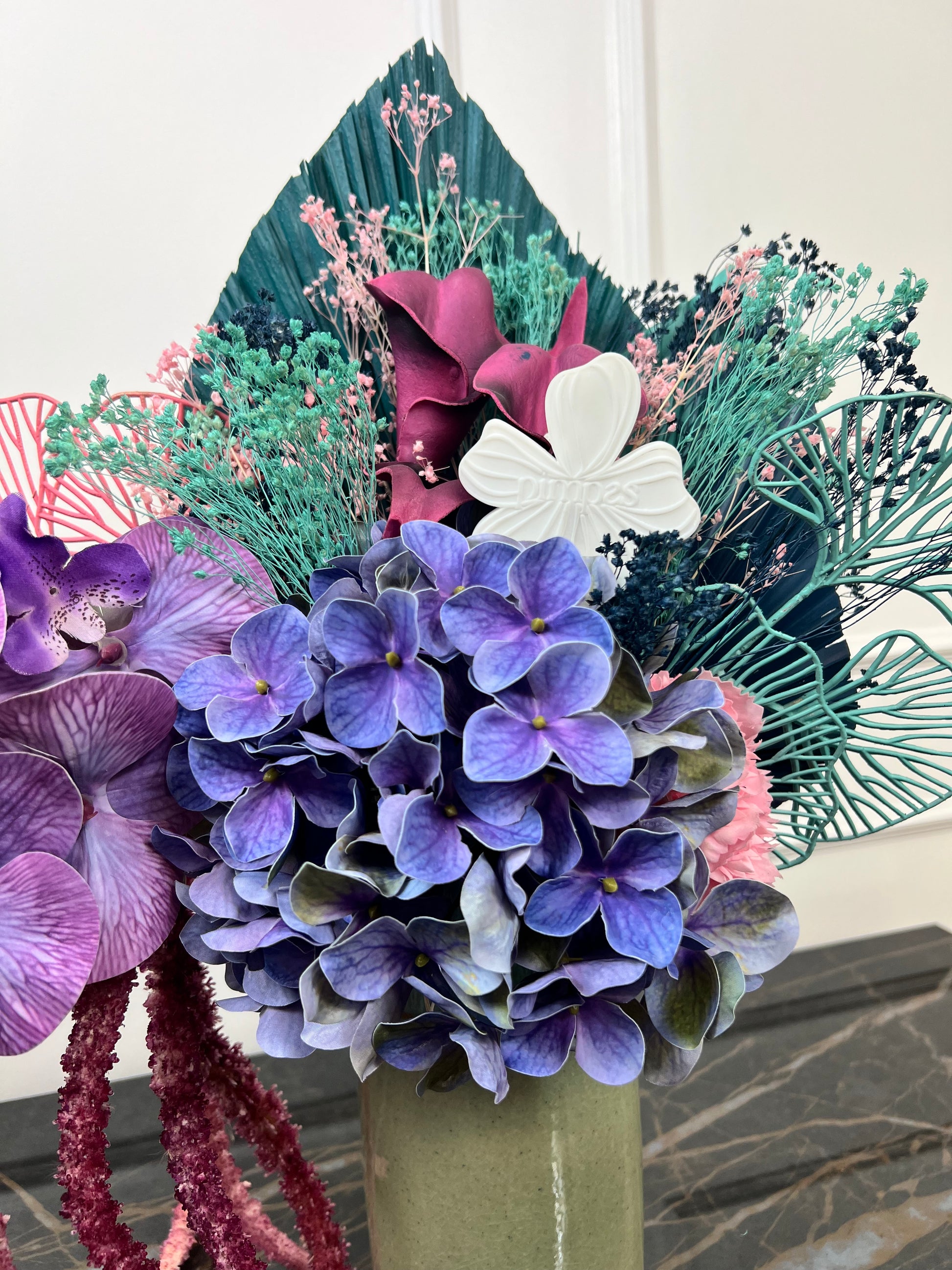 Rêverie d’indigo est un bouquet de fleurs éternelles à l’esthétique vibrante et audacieuse. L’hortensia violet profond, l’orchidée mauve et l’amaranthe tombante rose s’entrelacent à des feuillages cyan et bleu marine dans une composition à la fois poétique et contemporaine. Présenté dans un élégant vase en céramique vert d’eau, ce bouquet capte le regard et évoque un monde imaginaire aux nuances intenses.