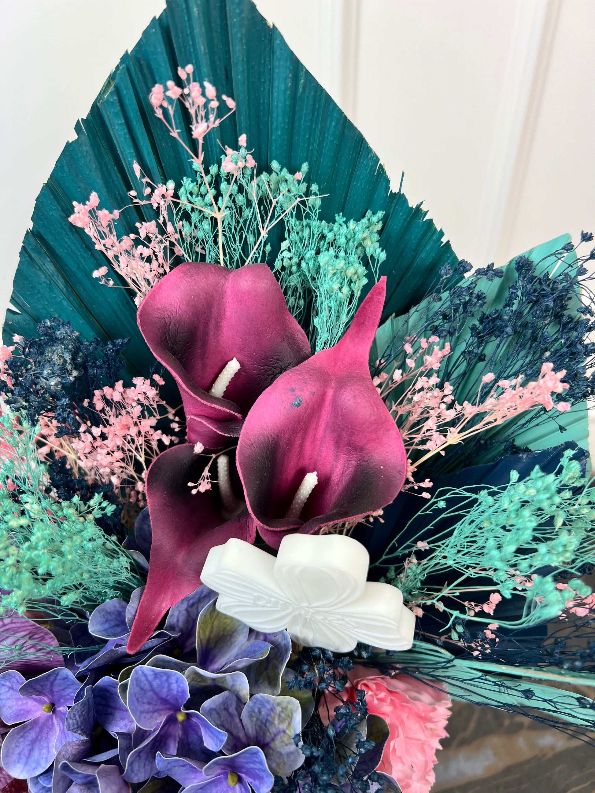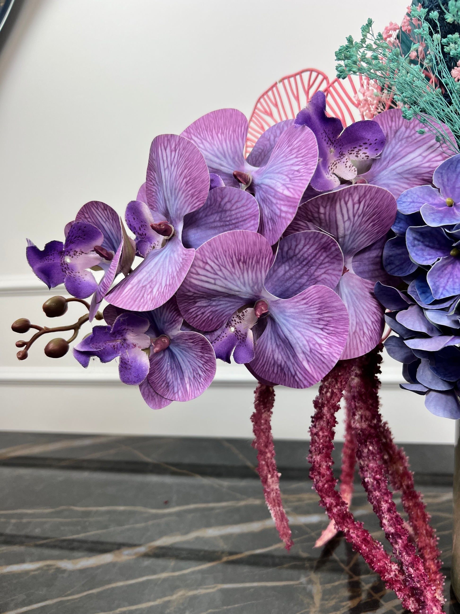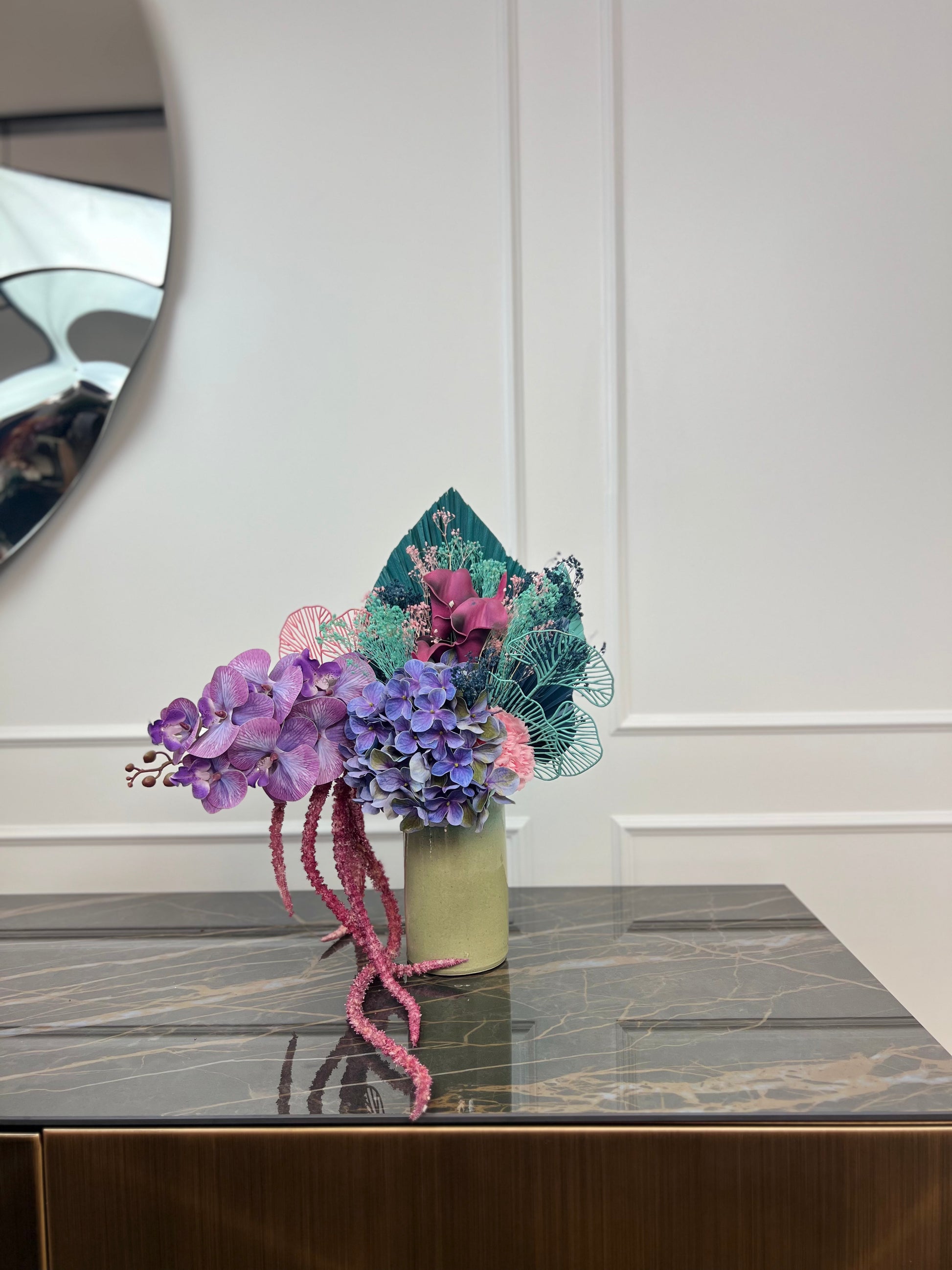 Rêverie d’indigo est un bouquet de fleurs éternelles à l’esthétique vibrante et audacieuse. L’hortensia violet profond, l’orchidée mauve et l’amaranthe tombante rose s’entrelacent à des feuillages cyan et bleu marine dans une composition à la fois poétique et contemporaine. Présenté dans un élégant vase en céramique vert d’eau, ce bouquet capte le regard et évoque un monde imaginaire aux nuances intenses.