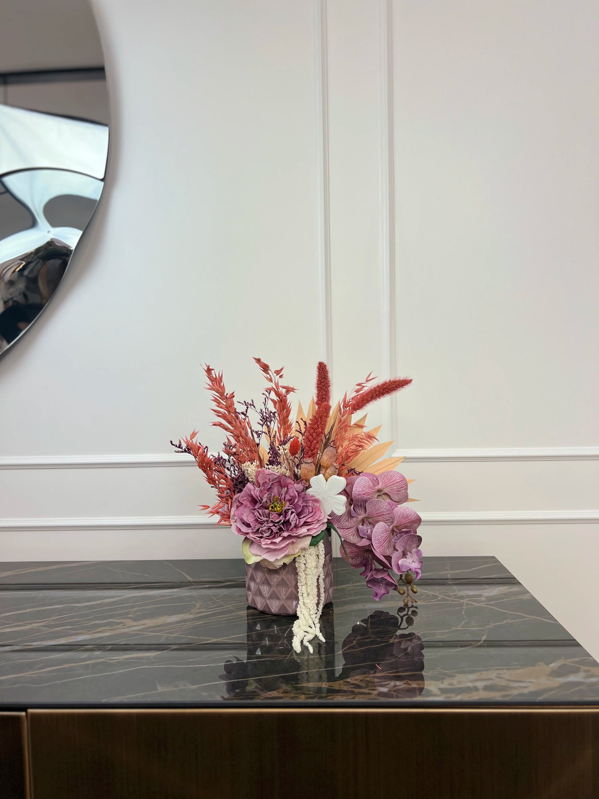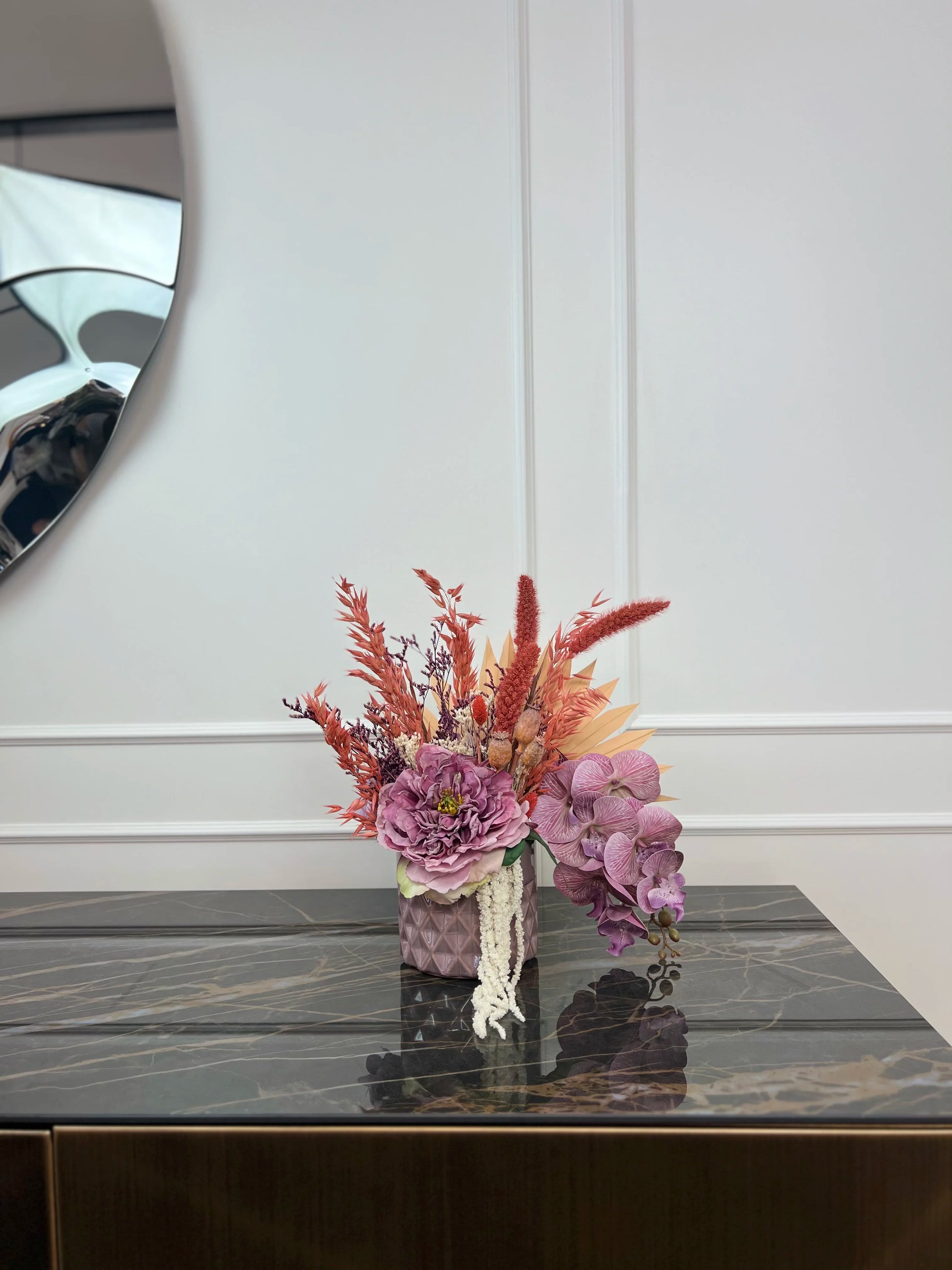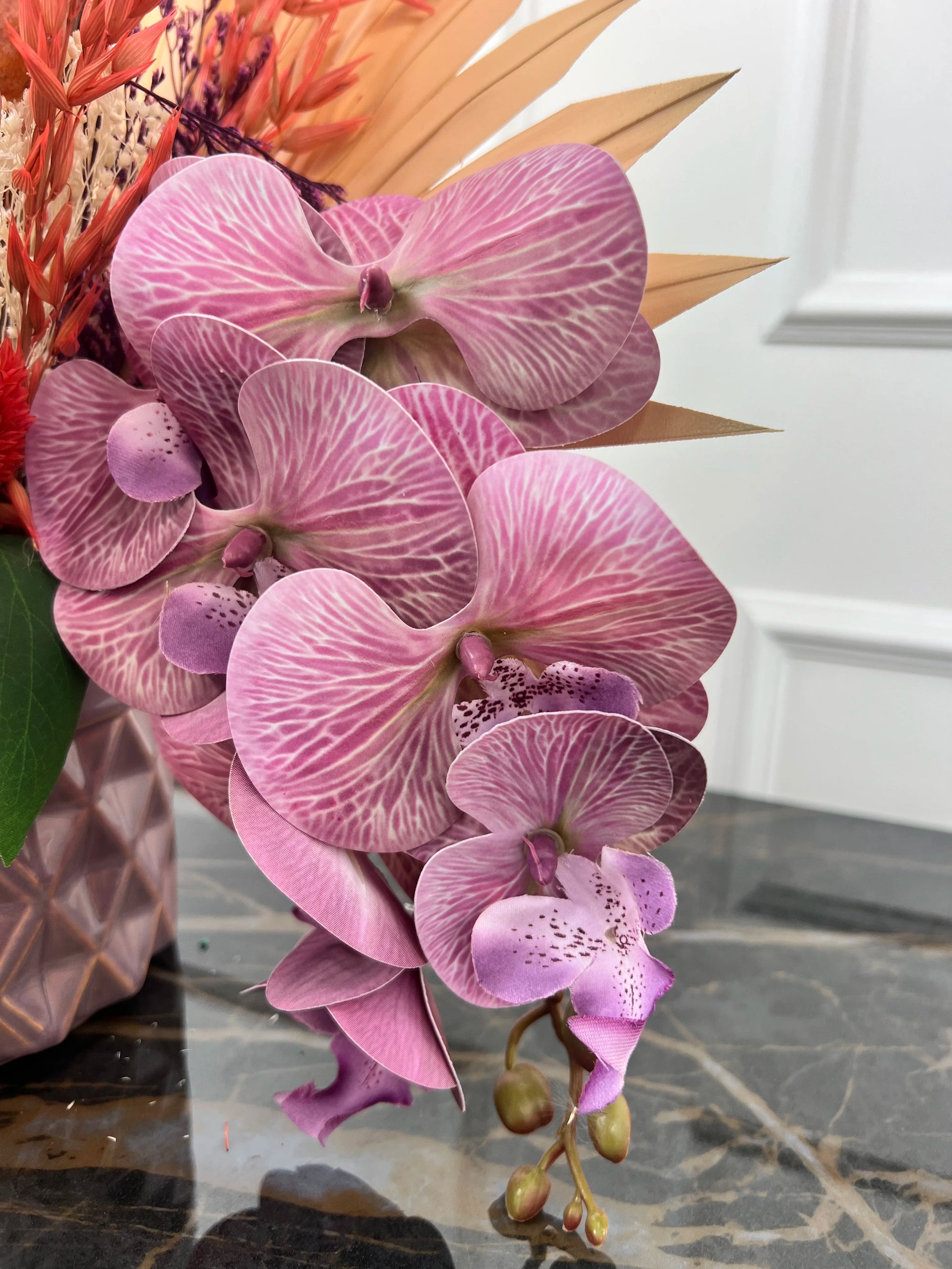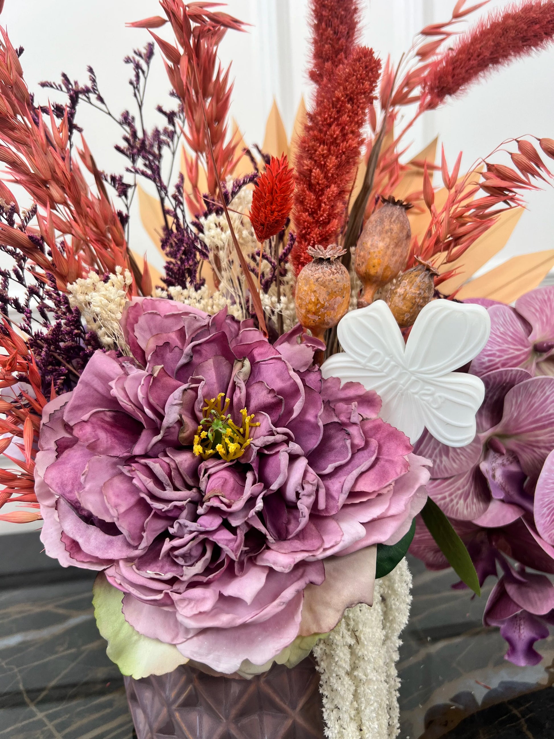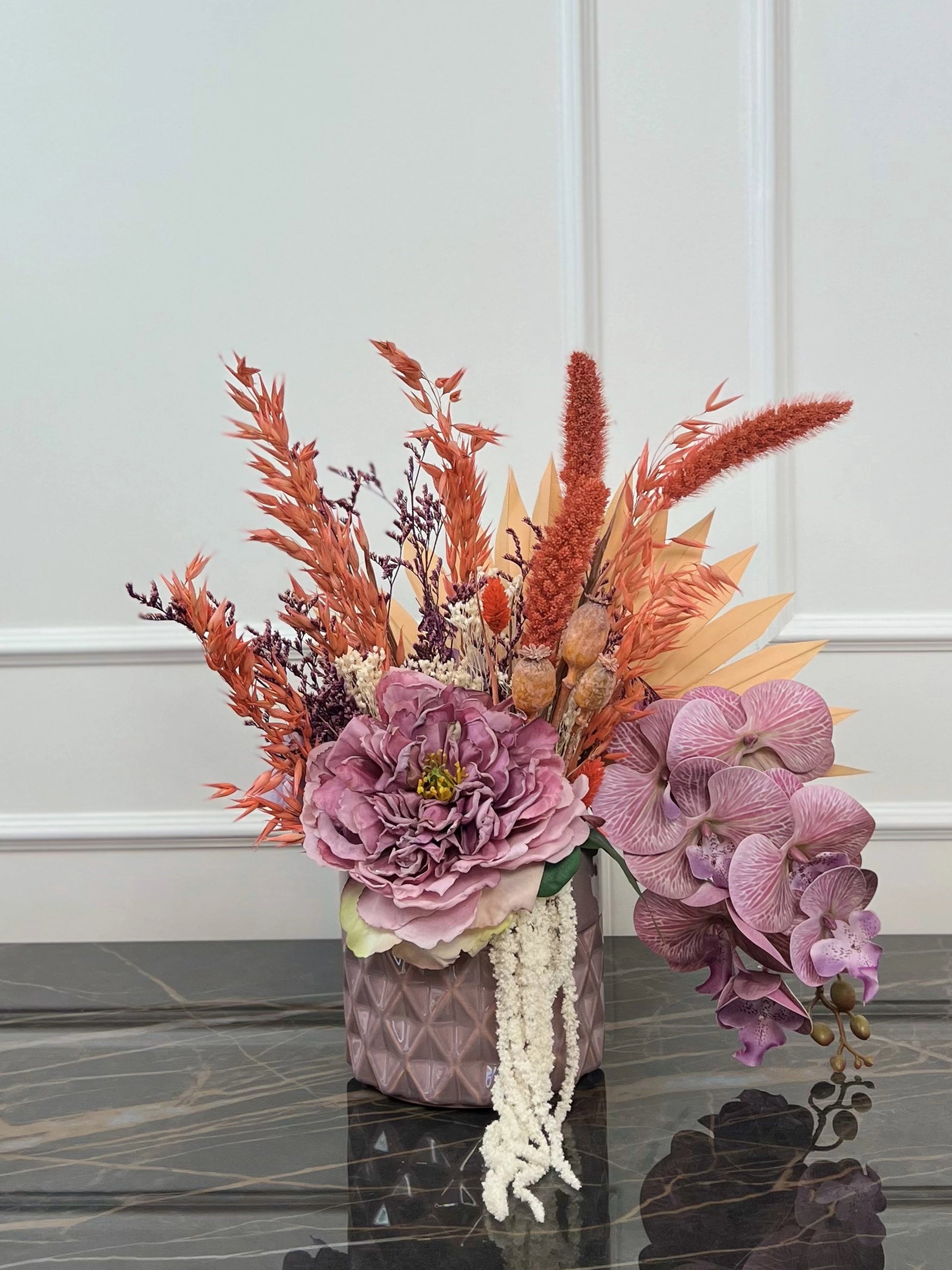 Un bouquet délicat aux nuances mauves et rosées, empreint de mystère et de douceur. La pivoine et l’orchidée nervurée mauve s’associent à l’hortensia dans un camaïeu élégant. Le desmodium, le pavot et le broom bloom blanc apportent légèreté et mouvement, tandis que l’avoine rose et le phalaris givré enrichissent la texture. Le palmier soleil vient sublimer l’ensemble avec une touche de lumière. Rêverie Pourpre invite à l’évasion, entre sensualité florale et poésie contemporaine.