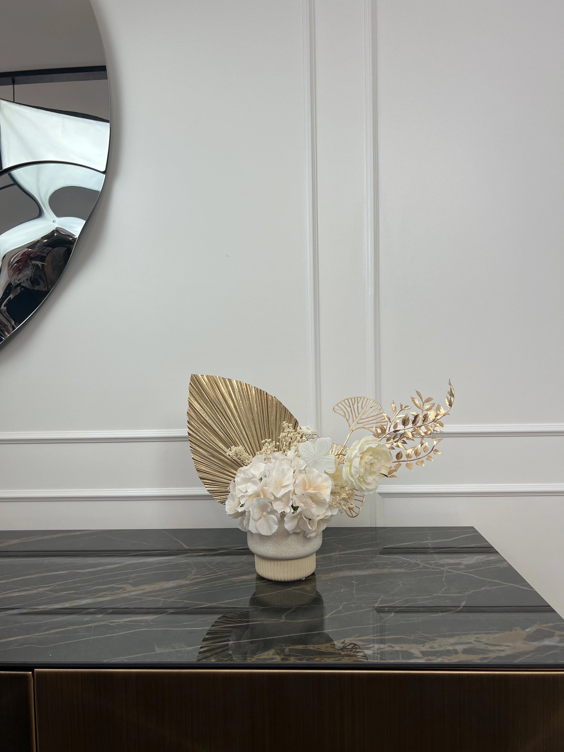 Épuré et rayonnant, Voile d'or sublime les intérieurs avec une élégance naturelle. L’hortensia blanc et la pivoine légère apportent douceur et volupté, tandis que le palmier doré, le ginkgo et le ruscus dorés diffusent une lumière précieuse. Le broom bloom blanc vient parfaire cette composition intemporelle, entre pureté et éclat doré.